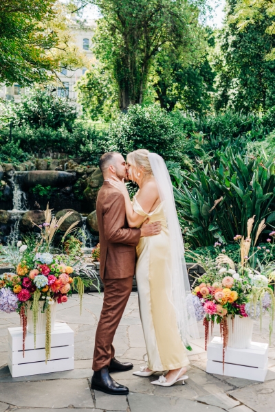 [Image one description: A newlywed couple share a kiss in a cosy courtyard outside a white-brick venue with yellow striped awnings. The bride wears a sleek gown and holds a bouquet of pink blooms, while the groom, in a dark suit, leans in close. ⁠