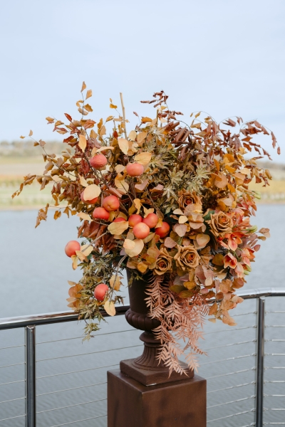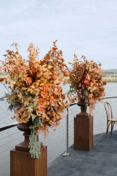 Debbie O’Neill was the florist for this romantic wedding, coming highly recommended by their photographer, Michael Briggs. “She was wonderful. She helped me plan the colours for my bridesmaid dress and the green ties/pockets for the groomsmen, and planned, organised and set up all the flowers/decoration for the day. We requested seasonal flowers/leaves and fruit decorations for the tables to keep guests entertained between dinner service. She delivered above and beyond.”