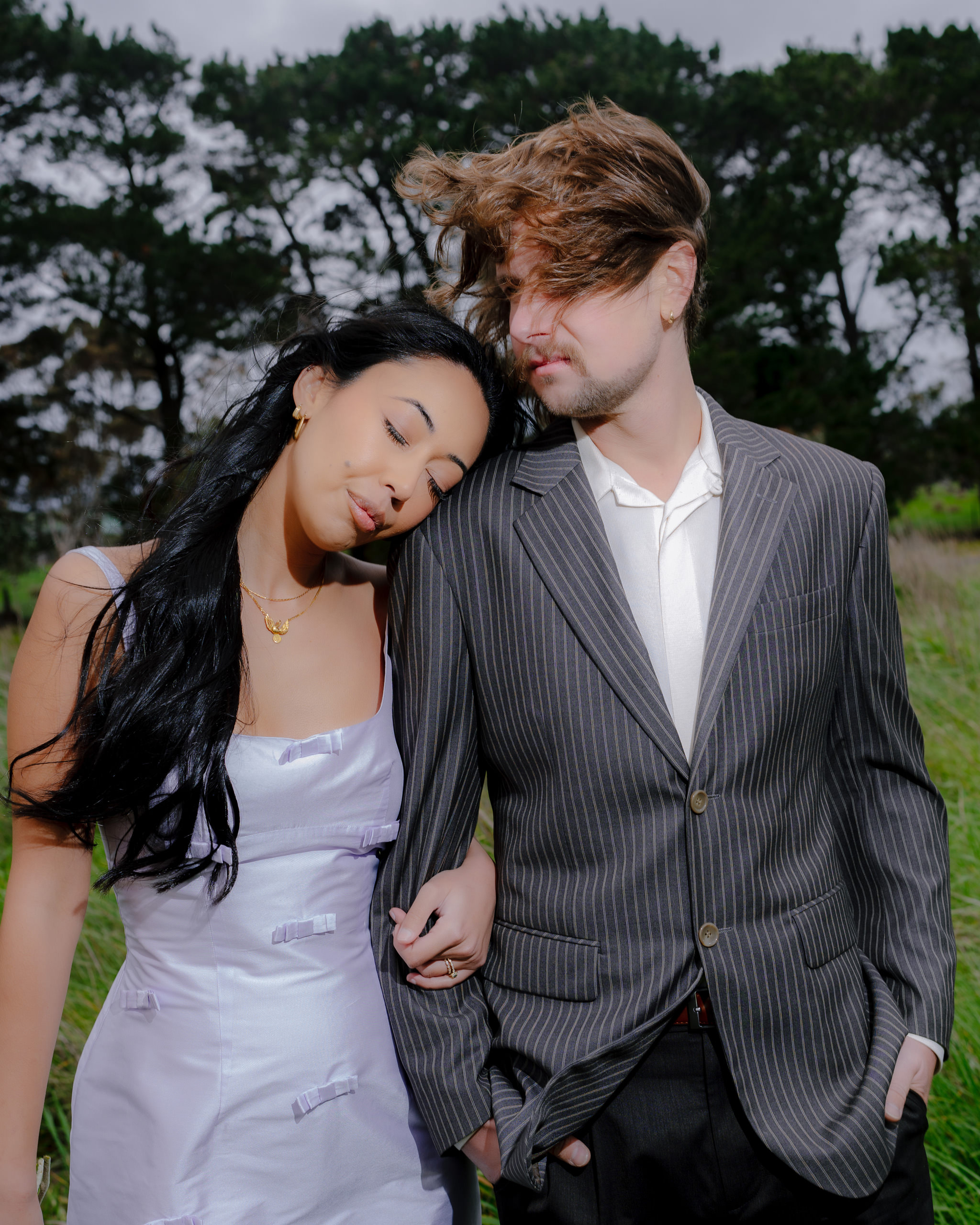 [Image one description: ⁠In front of a lake, this couple poses for their wedding portraits. The groom stands on the left, wearing a rust coloured suit and a bolo tie, hands in his pockets. The bride stands slightly in front of him, turned away from the camera with a tattooed hand on his chest. She wears a white dress with polka dots all over and sheer puff sleeves.⁠