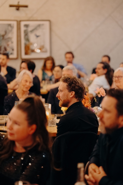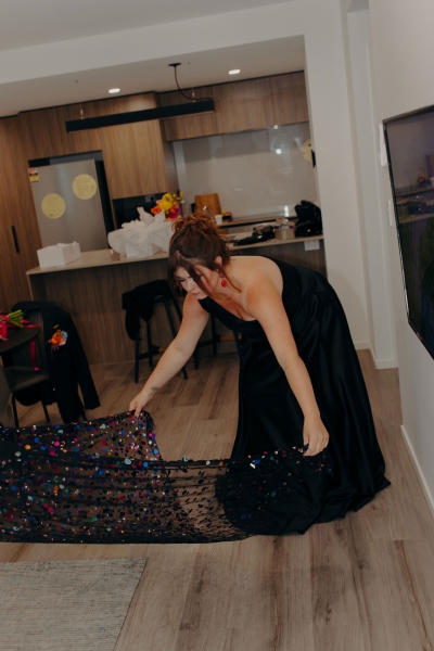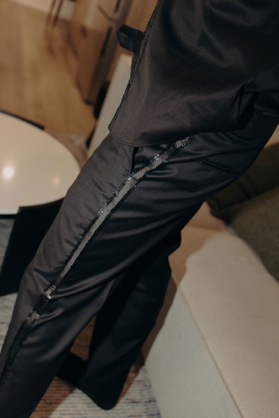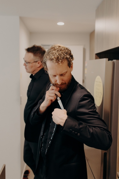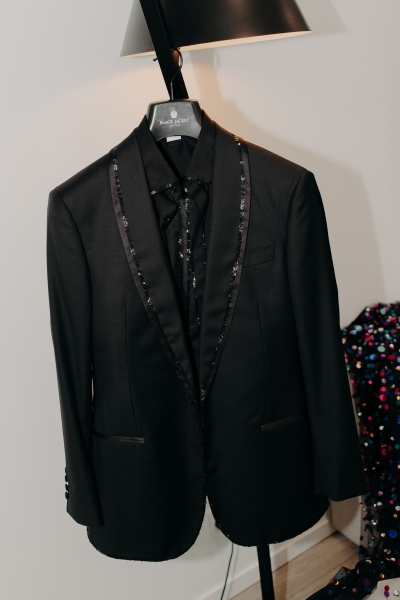 Another inspired outfit, this time drawing inspo from Ryan Gosling’s suit from the 2024 Oscars. John wore a black tux with an open collar and incredible sequin trim. “It was the perfect balance of classic and glitz. Black Jacket Suiting did a great job at tailoring the tux and setting me up for sequins to be hand-sewn by The Fitting Room on Edward. Everyone seemed pretty stoked to work on something a bit different!”
