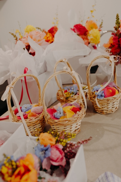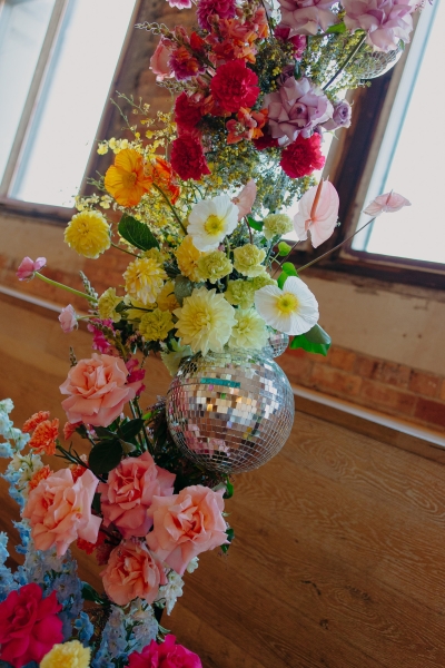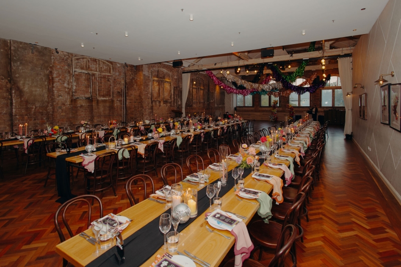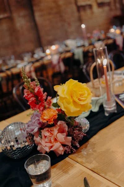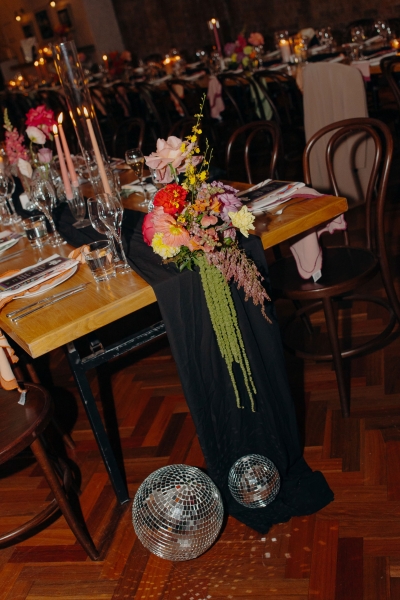 The incredible styling and flowers were done by Main Event Weddings, filling The Warehouse with gem tones and bright colours. “They did a stellar job, and the place was covered in lots of deep colour. We ended up taking a lot of them home, couldn’t bear to bin them!”
