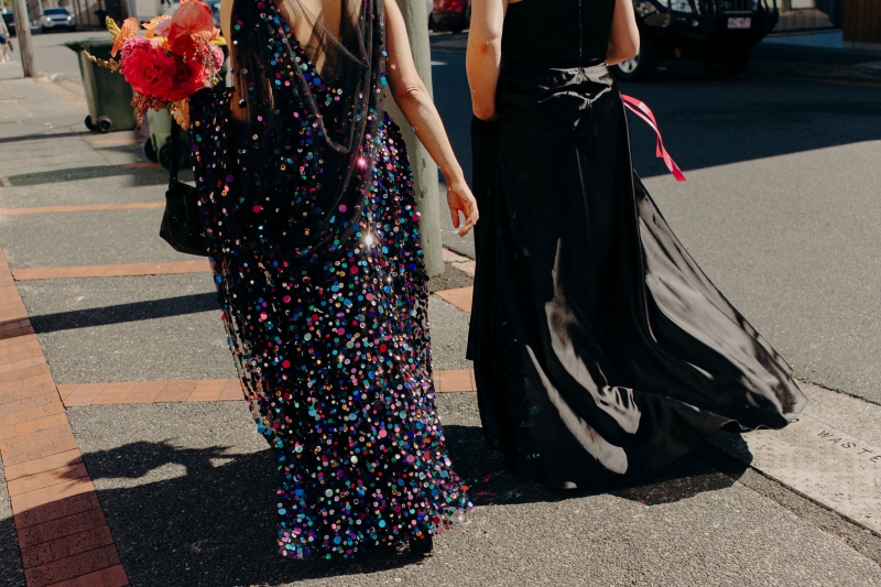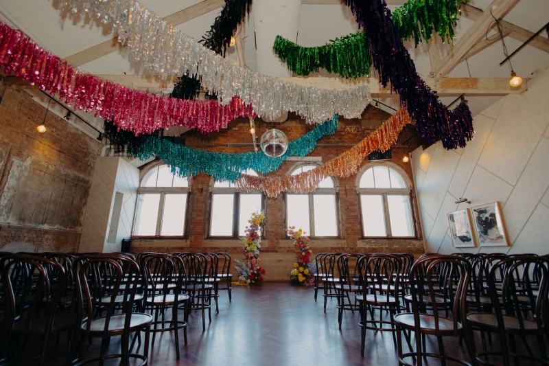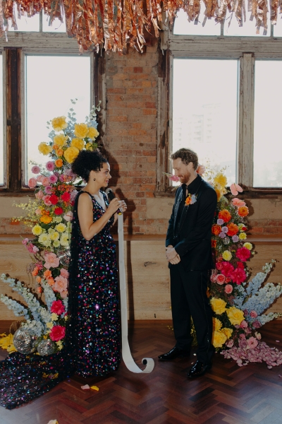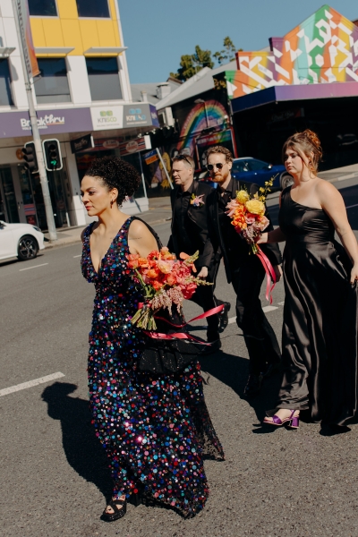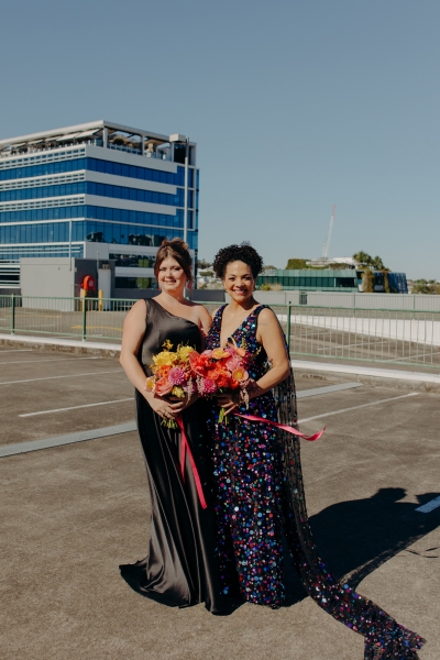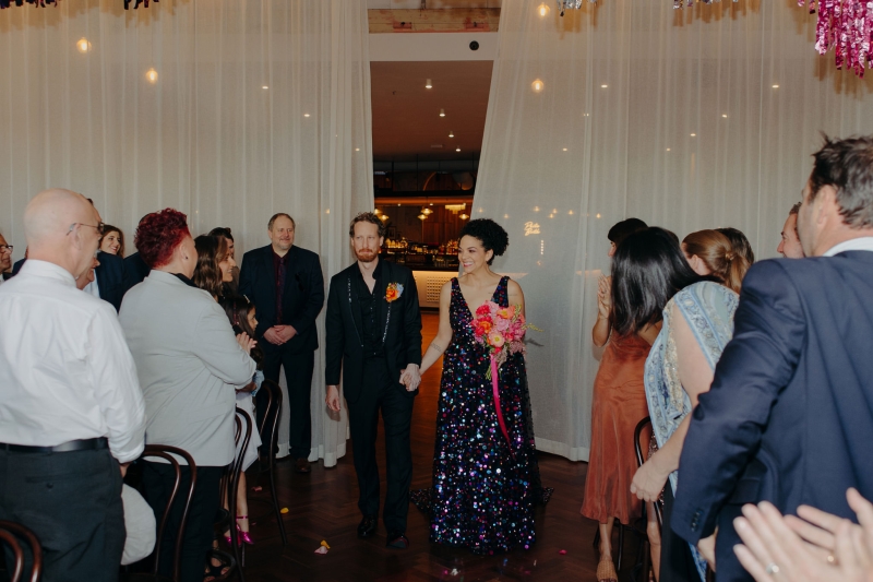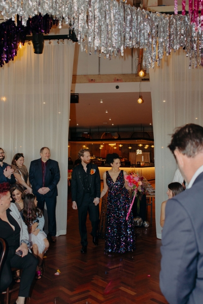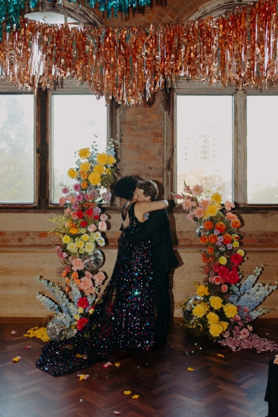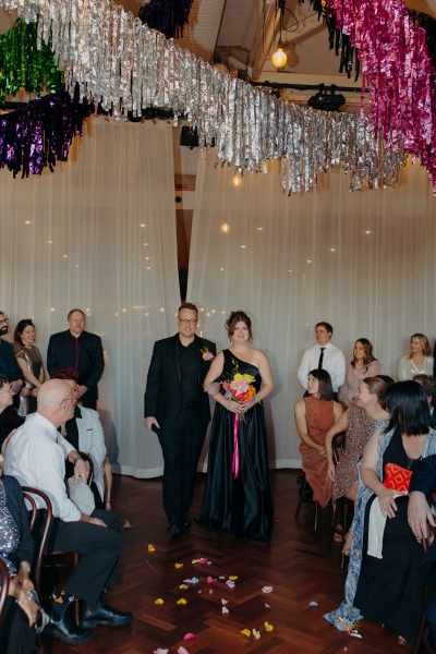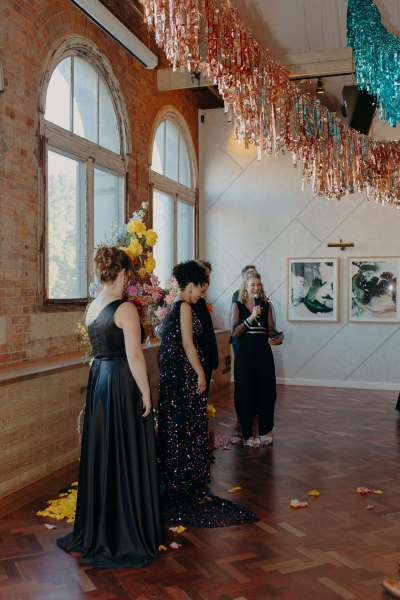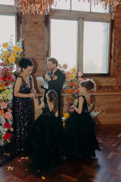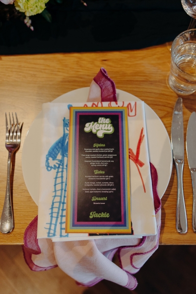 The venue’s 70s-inspired disco-glamour setup was all intentional. From the bright Bangin’ Hangins on the ceiling during their ceremony to the giant pile of brownies from I Heart Brownies, everything was put together with the goal of pure joy. “About 6 months before the weddings, (unprompted) our girls drew pictures of us at our wedding with very fancy clothes on. We loved the drawings so much, we printed them on tea towels and gave them to guests as wedding favours. Everyone was pretty into them, and also everyone was in their 40s.”