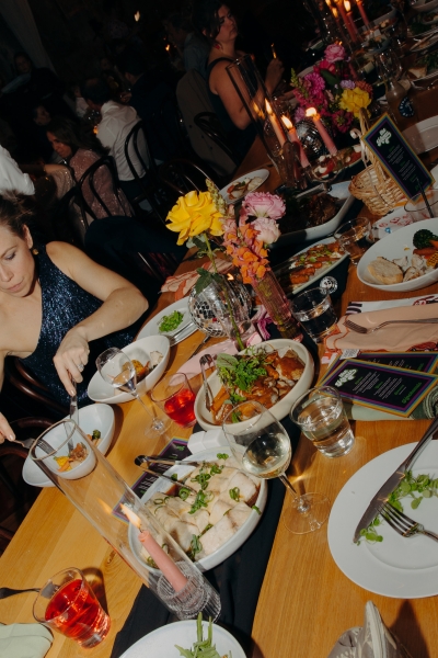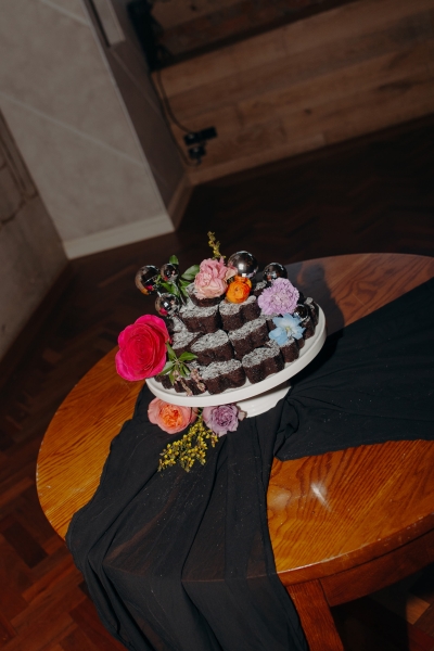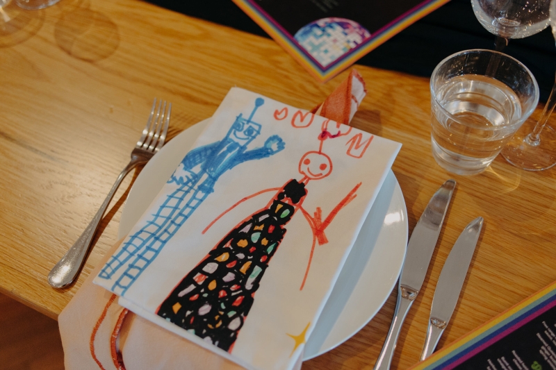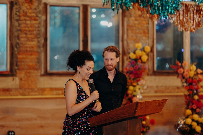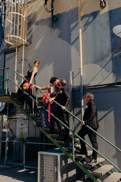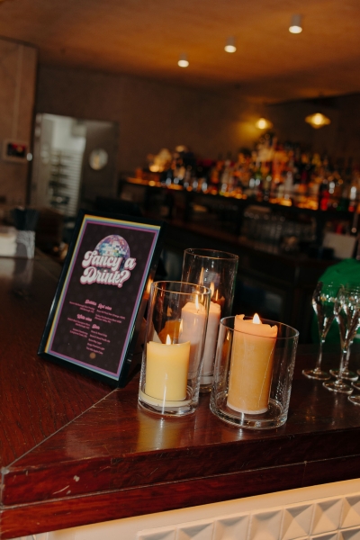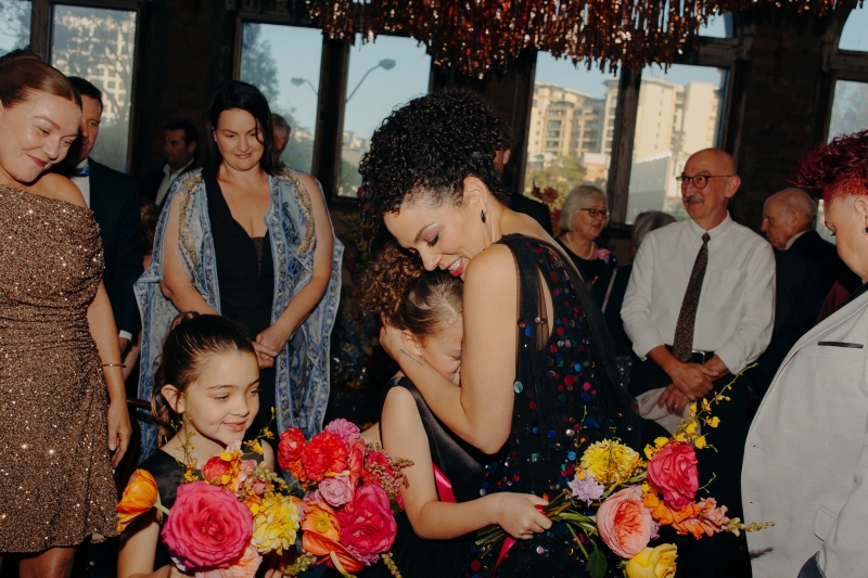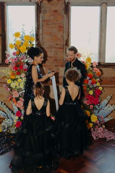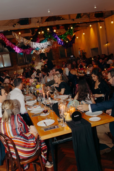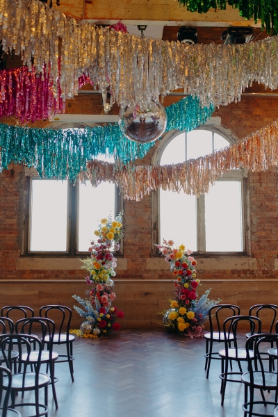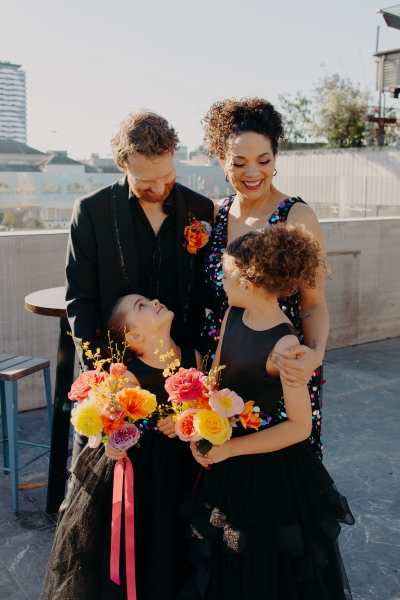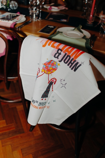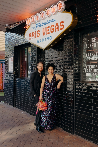 The venue’s 70s-inspired disco-glamour setup was all intentional. From the bright Bangin’ Hangins on the ceiling during their ceremony to the giant pile of brownies from I Heart Brownies, everything was put together with the goal of pure joy. “About 6 months before the weddings, (unprompted) our girls drew pictures of us at our wedding with very fancy clothes on. We loved the drawings so much, we printed them on tea towels and gave them to guests as wedding favours. Everyone was pretty into them, and also everyone was in their 40s.”