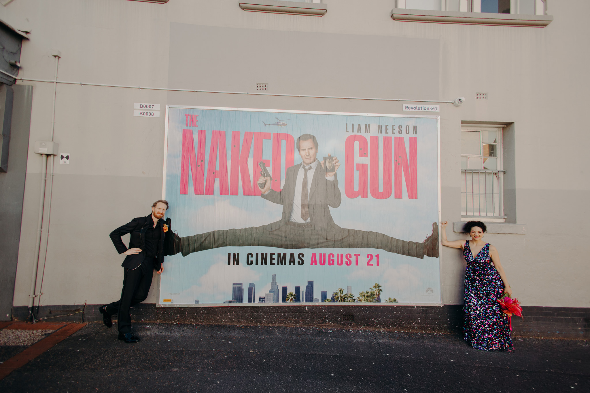 [Image description: A couple walk arm-in-arm down a softly lit city laneway at night. The person on the left is wearing a classic black tuxedo with a white shirt and bow tie, smiling warmly as they look toward their partner. The person on the right is wearing a fitted, floor-length black evening gown with intricate beading and sheer panel details, carrying a small silver clutch and looking ahead with a relaxed expression. They appear joyful and connected, mid-conversation. The setting is in Melbourne, lined with restaurants and cafés, with glowing signage overhead and outdoor seating visible to the side.]⁠