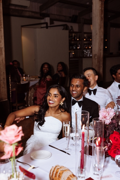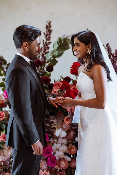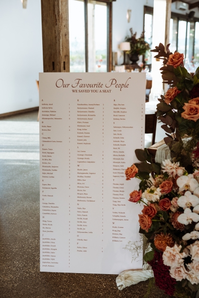 Florals are a huge part of South Asian weddings, so it was important for Dipti and Yasith to have an abundance of fresh flowers. “Red is traditionally the wedding colour of Indian weddings (my culture), and so they were incorporated heavily in our florals and signage. Floss and Fleur, our amazing florist, did an incredible job with our lush flowers and gorgeous reception backdrop. She also worked with us to ensure that our signage was written in both English, Tamil and Sinhalese to incorporate our Australian, Sri Lankan and Tamil backgrounds,” Dipti explained.