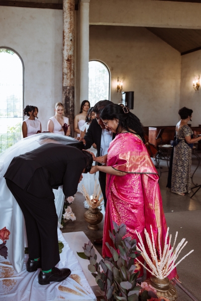 Their ceremony was a swirling pot of Australian, Indian and Sri Lankan cultural elements, primarily focusing on the Sri Lankan Poruwa ceremony. They completed the ceremony with personalised vows and a ring exchange. “The Poruwa ceremony (the traditional Sri Lankan wedding ceremony) includes a ritual where elder family members come up to the stage and bless us. This was a touching and memorable moment where we received good blessings and love from our extended family, some of whom had come all the way from India and Sri Lanka to be by our side for the day,” Dipti shared.