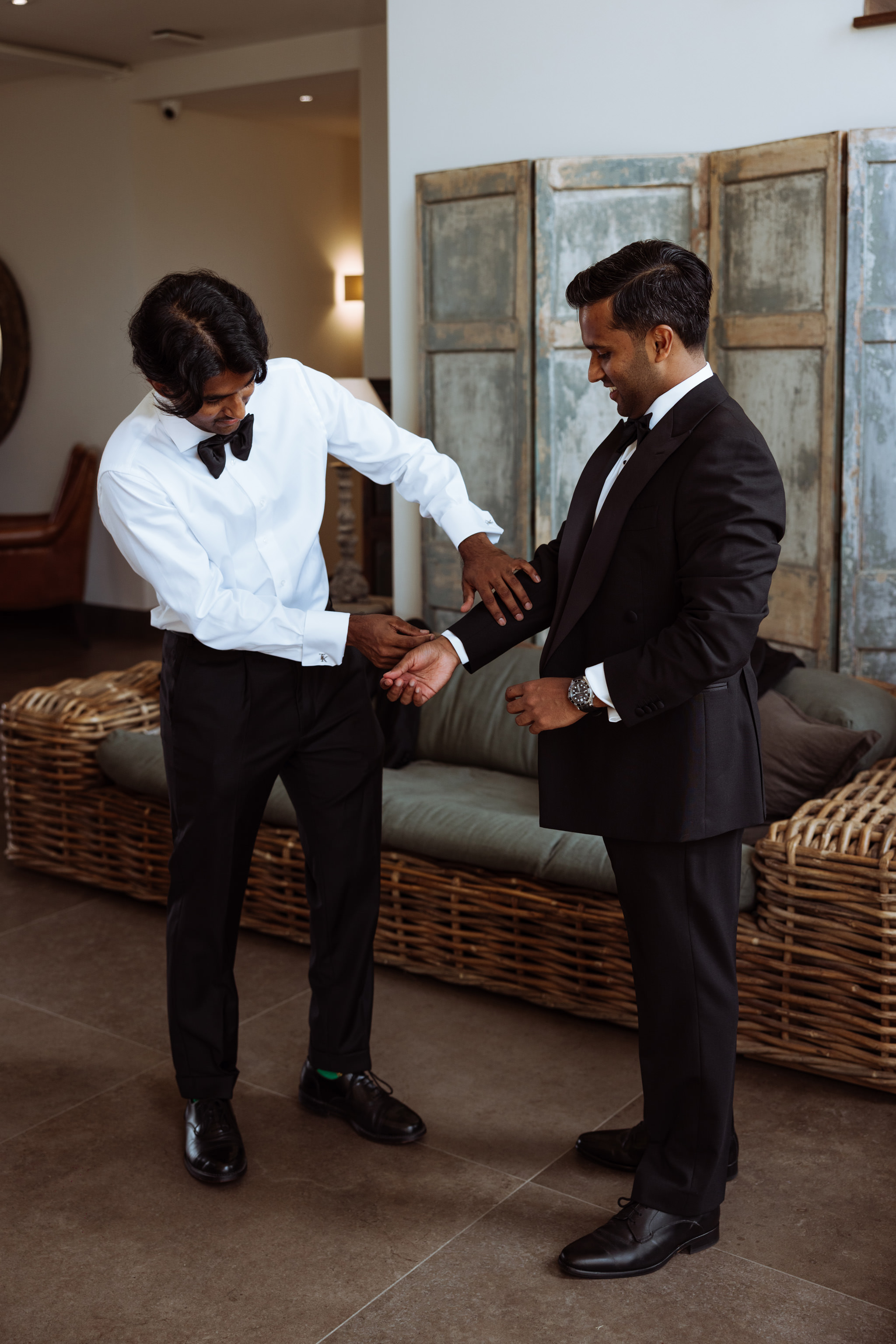 [Image one description: A joyful couple poses by a window. The groom wears a classic black tuxedo with a bow tie and orange boutonniere, smiling as the bride stands behind him with her arm around his shoulder. She wears a sheer, floral-textured gown with long sleeves and a veil.⁠