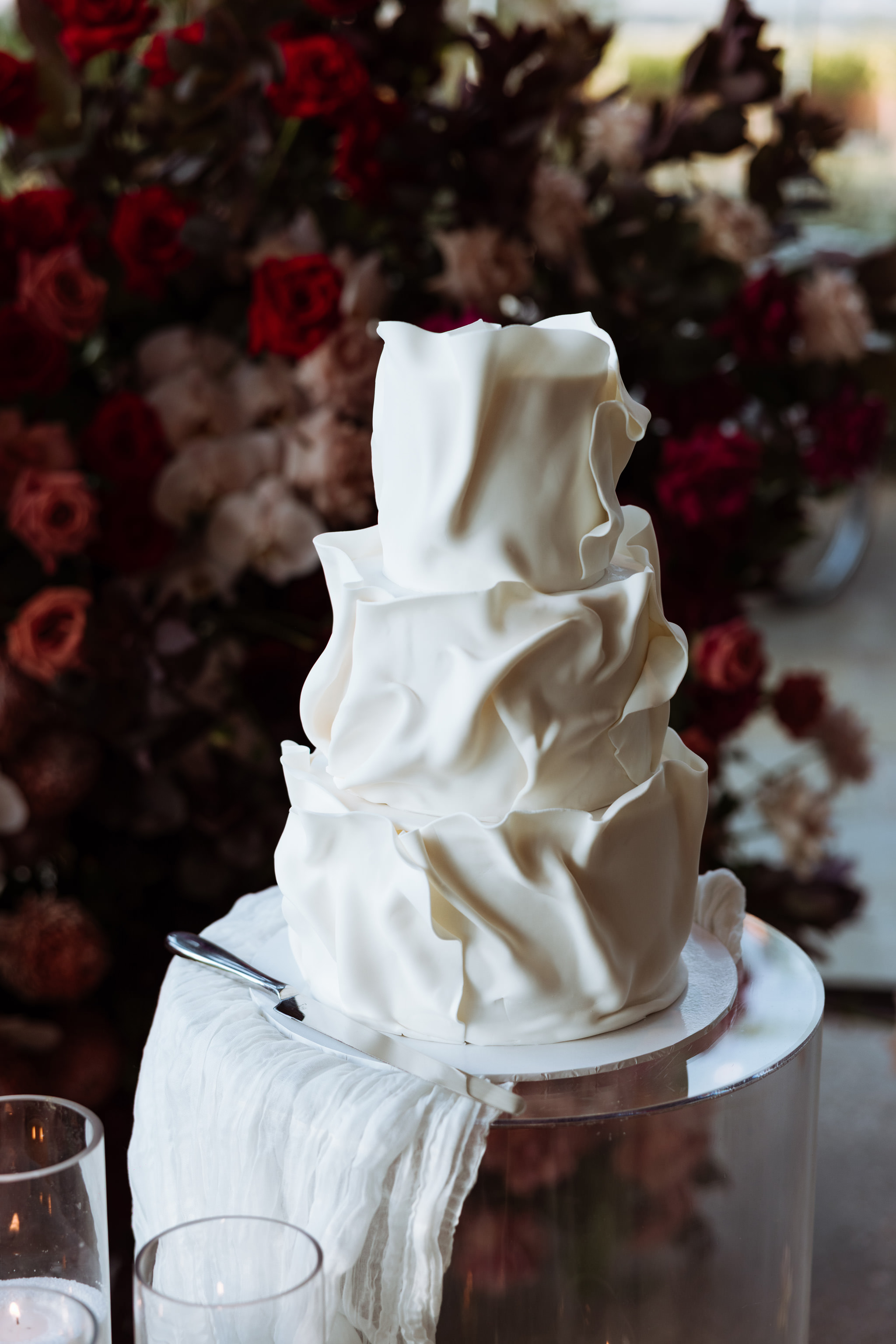 Image four description: A shot of the pink vintage tiered cake, with cherries, pink and red frilly frosting and little cherubs decorating the tiers.]⁠