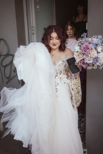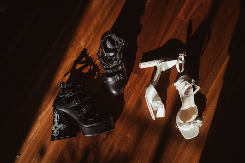 To match the enchanting vibe of the day, Beth wore a dusky princess-style gown with floral embroidery and a dreamy skirt. She finished the look off with these rocking studded black platform heels “I fell in love with the delicate floral embroidery on the body, and floaty skirt – it made me feel like a fairy princess.”