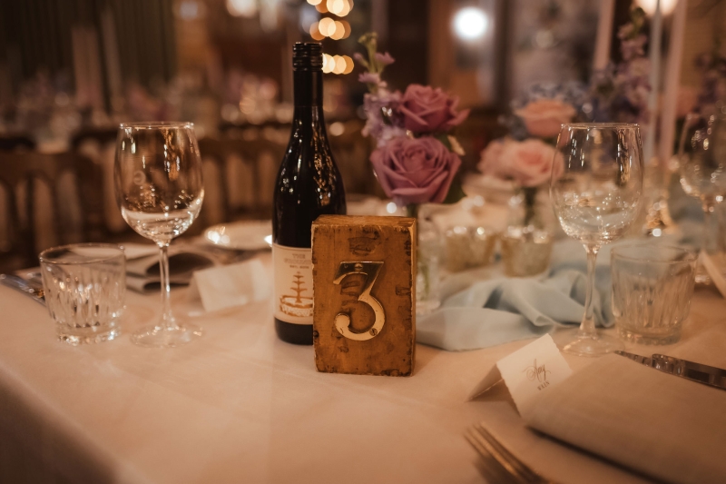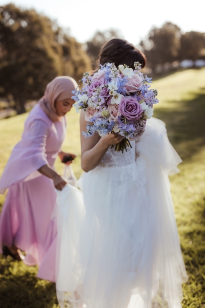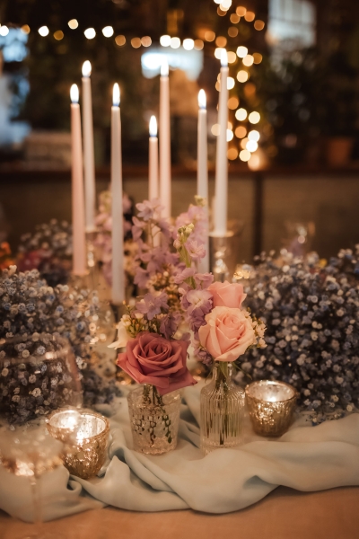 Flowers by Lovely Bridal Blooms were kept in the same soft pastel theme, bursting with purples and pinks. “They were arranged in scattered bud vases across the guest tables, interspersed with tea light candles. The bride’s table also included a centrepiece cloud of baby’s breath, and we each had a bouquet matching the same pastel colour palette.”