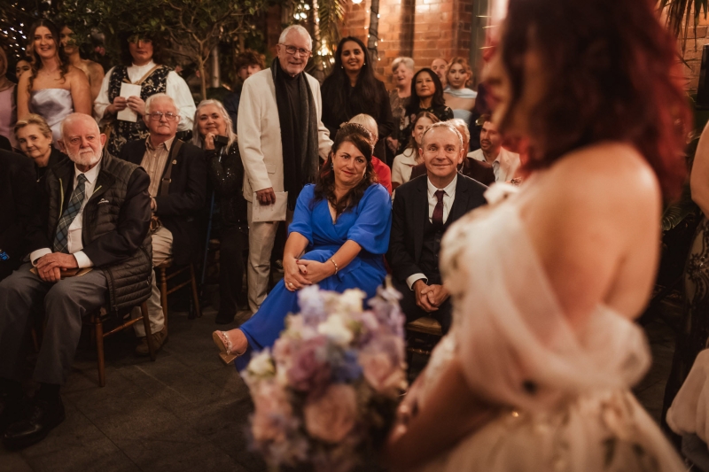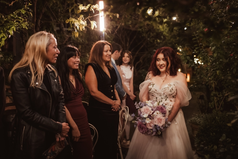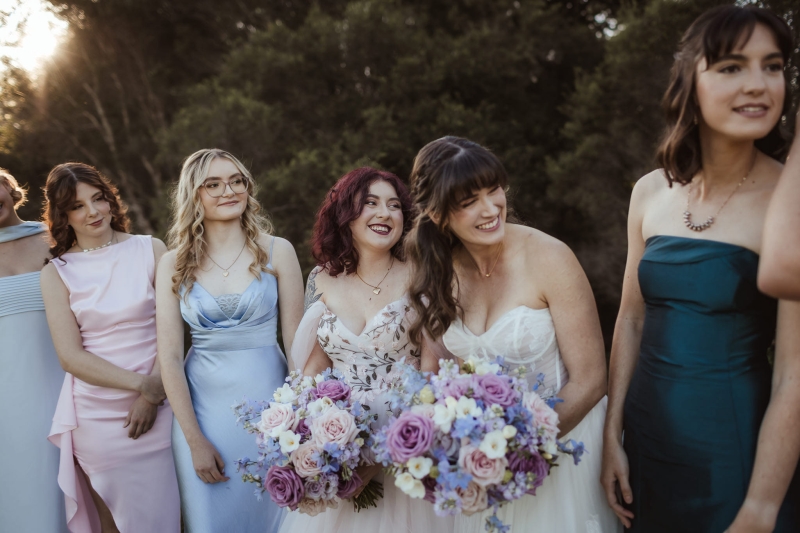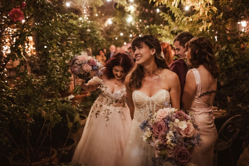 This pre-ceremony photoshoot was one of Beth and Jeanne’s favourite parts of the day, surrounded by their wedding party and the bubbling anticipation for what was about to come. “However, trekking through the park in our flowy dresses for photos, we realised as we started to make our way to the venue that in our many layers of tulle we had several bugs and crickets trapped – and we had a good laugh, and we both helped each other shake out our layers and free them on our way in. I also had a heart locket necklace I had been wearing as part of my jewellery. I’d worn it all day and in all the photographs; however, about 15 minutes before we went to walk down the aisle, the clasp snapped, and despite all the efforts of our bridesmaids, it couldn’t be put back together. Still, it just so happened that my little sister was wearing a nearly identical heart locket that was actually my mum’s, so she gave it to me to wear down the aisle instead. It was even more meaningful getting to wear that, and it turned a stressful moment into a special memory.”