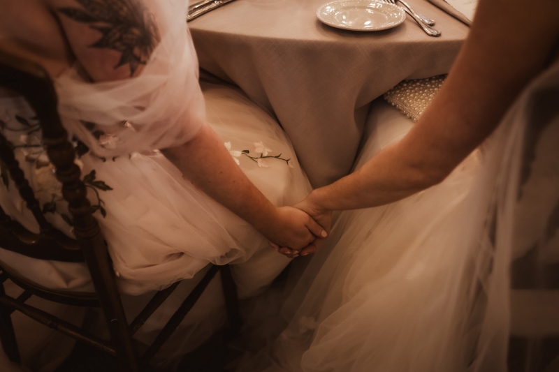 Jeanne walked down the aisle first, with Beth following soon after, both of them walking alone. An acoustic cover of “I Will Follow You Into The Dark” recorded by their dear friend floated through the air as they entered. “The music for the ceremony was really important to both of us. We are both musicians ourselves, and it holds a special place for us, so having the music we walked down the aisle to recorded for us by someone who knew us and our journey and love for each other just filled the moment with so much more emotion. We were both already shedding tears by the time we made it down the aisle!”
