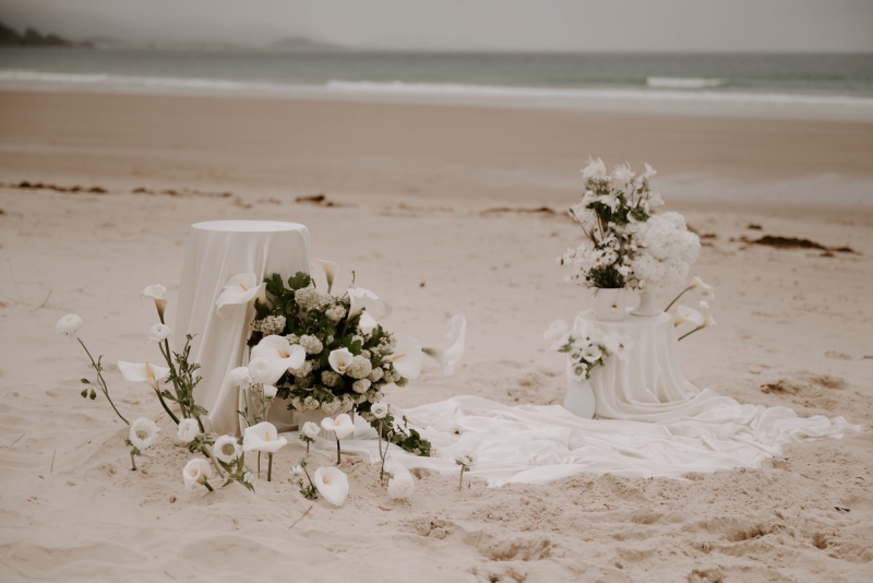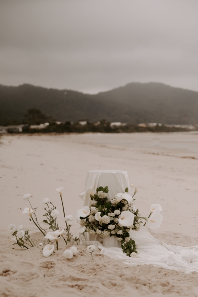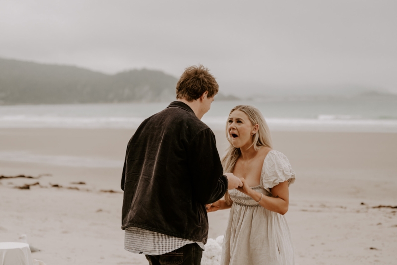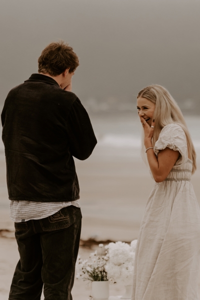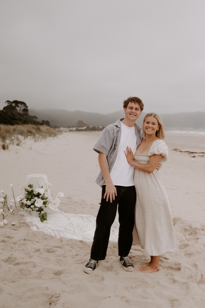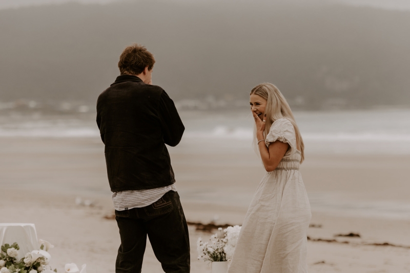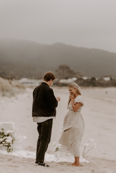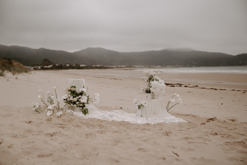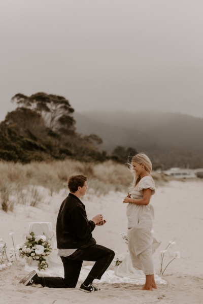 The perfect spot for this surprise proposal shoot was Sisters Beach in Tasmania. Jay had told Kennedy they were having a family photo shoot, where they arrived at a beautiful setup done by Bekk from Mollie & Mae, complete with silk and flowers.