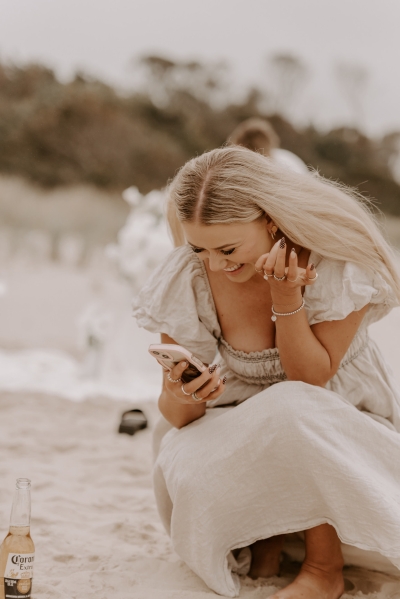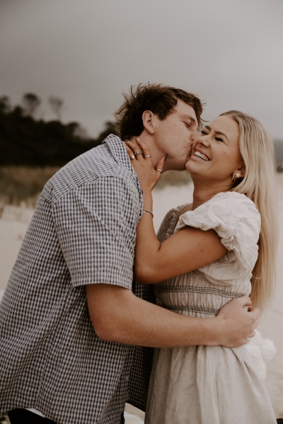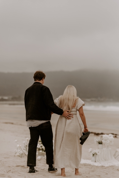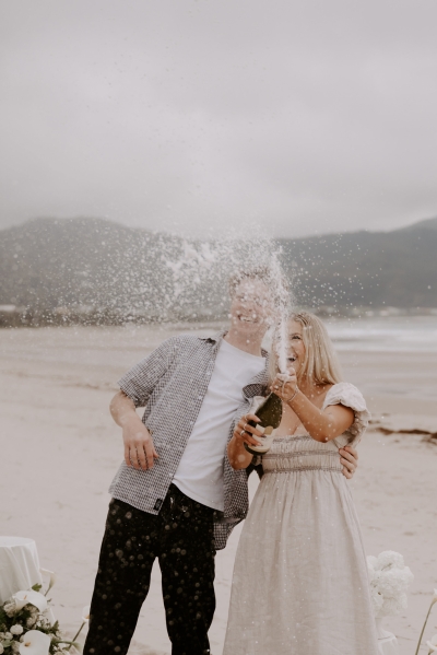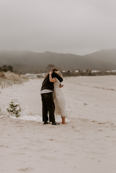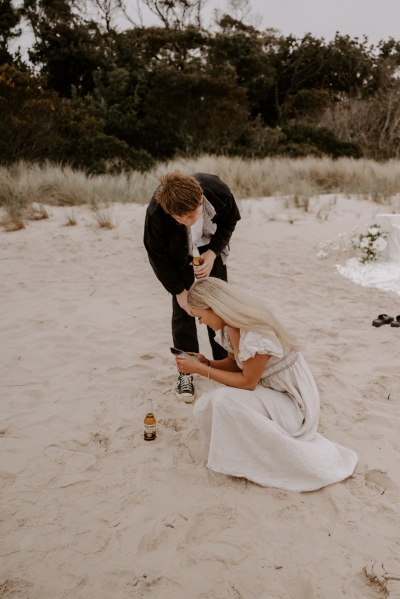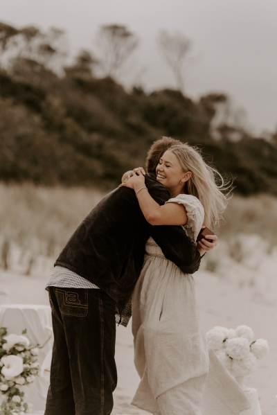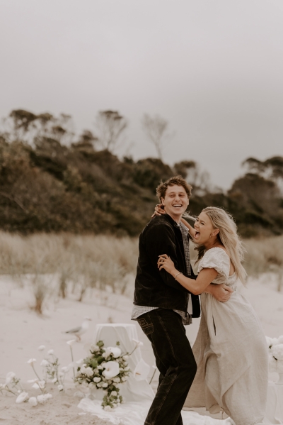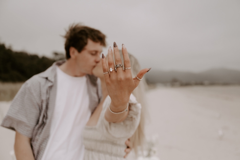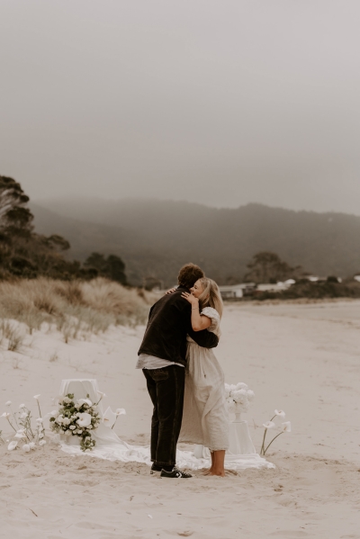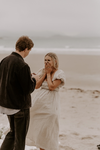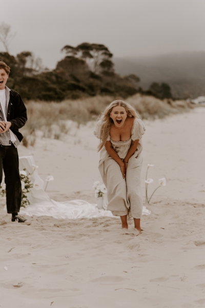 The perfect spot for this surprise proposal shoot was Sisters Beach in Tasmania. Jay had told Kennedy they were having a family photo shoot, where they arrived at a beautiful setup done by Bekk from Mollie & Mae, complete with silk and flowers.