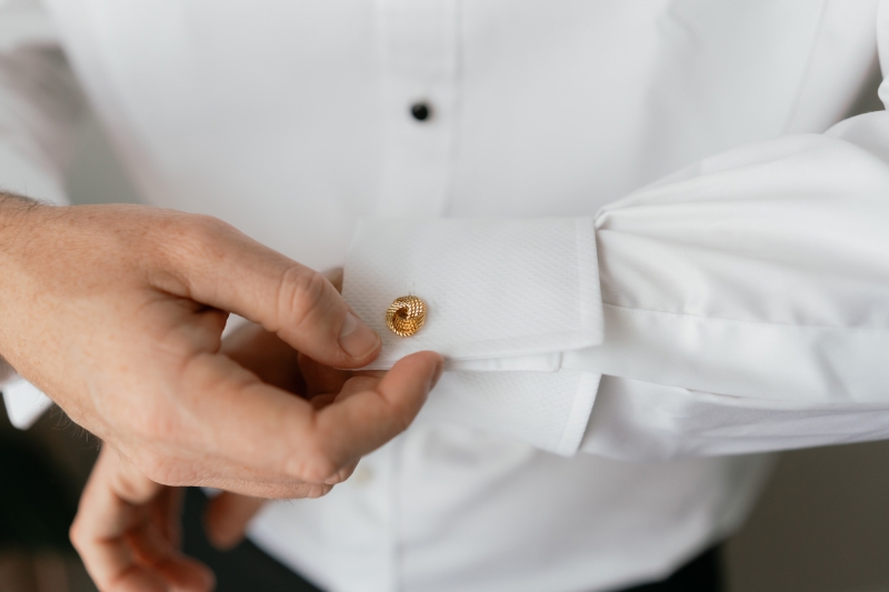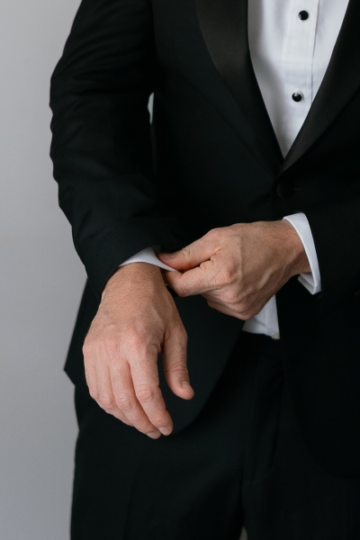 Brendan wore a classic, sleek black tuxedo from MJ Bale, with Sarah adding, “He is very classic with his styling, so we wanted something very simple but sophisticated.”