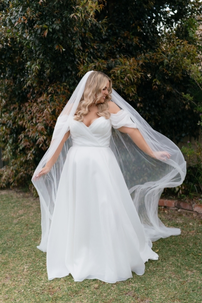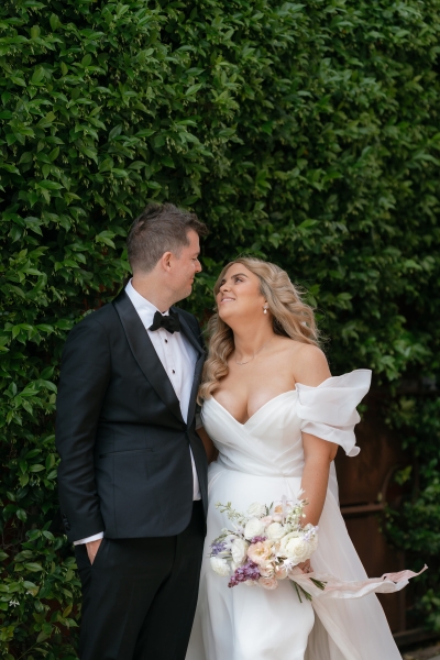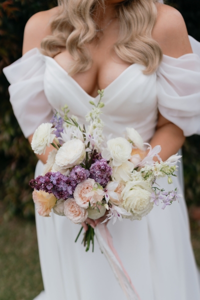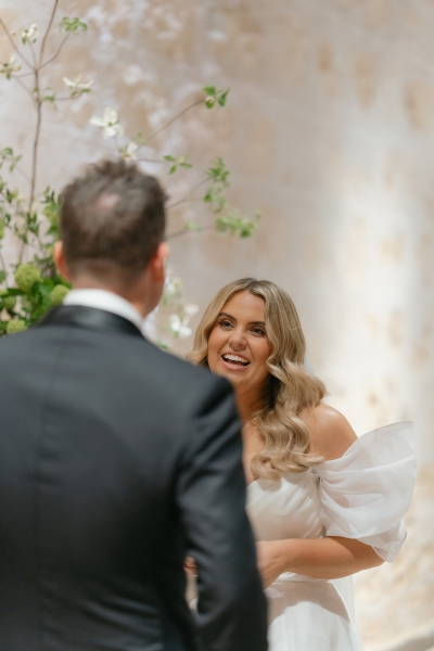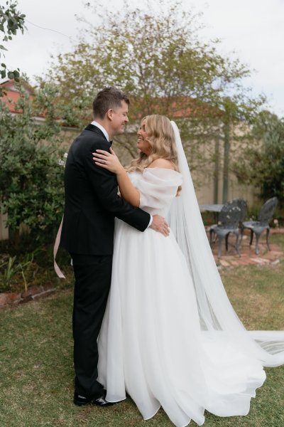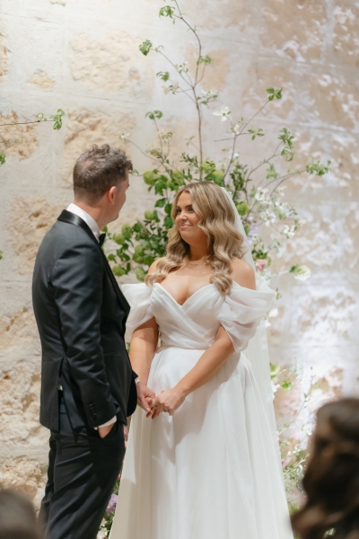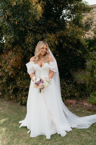 Luv Bridal in Cannington is where Sarah found her own gown. With a stunning V-neckline, off-shoulder neckline, and whimsical, floaty fabric, it was the perfect addition to their romantic whimsy vibe. “I was originally looking for something more minimal and understated. When the lovely sales assistant suggested this dress to me on my first try-on appointment, my three sisters instantly loved it, and it remained their favourite throughout the whole dress shopping process. I was surprised by how taken I was with the dress, but it took me a little while to decide if I could carry off just that little bit more drama. Looking back, I don’t know why it took so long; it was the perfect dress,” Sarah shared.