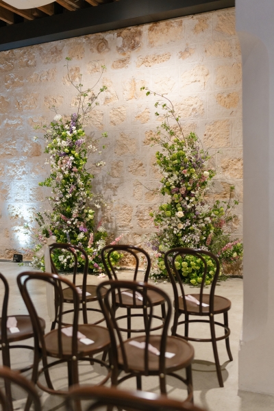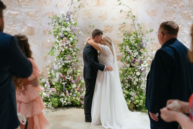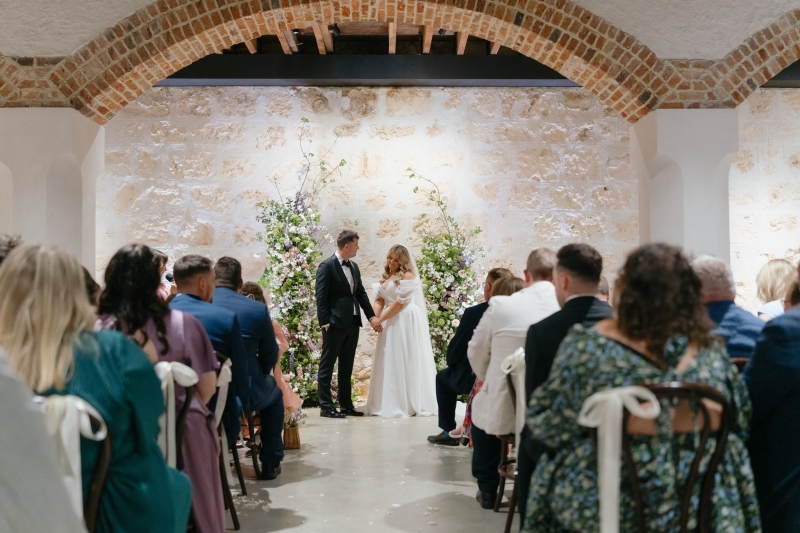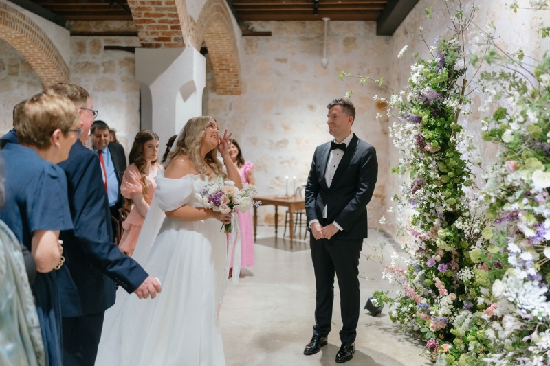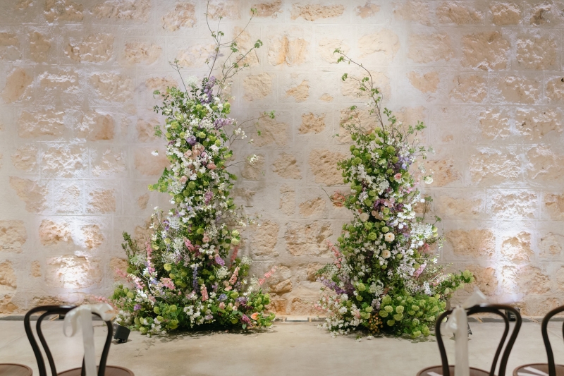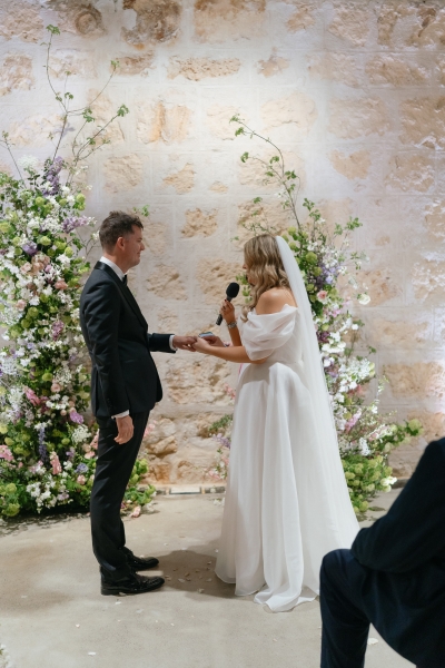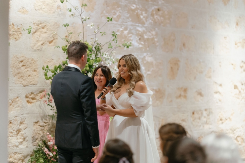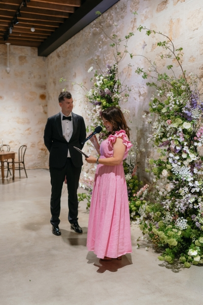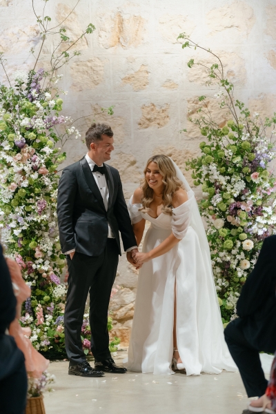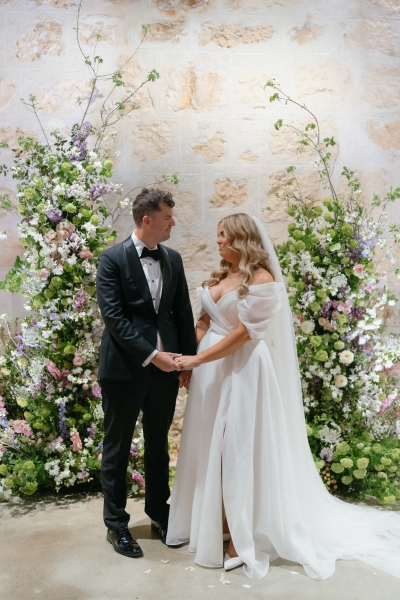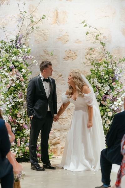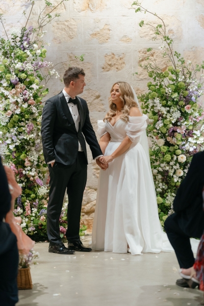 If there’s one thing Sarah loves, it’s being surrounded by vibrant flowers! So when she stumbled across Jane from Wildwood Floral, it was love at first sight. “I love to fill the house and the garden with flowers, and Brendan will invariably surprise me with a gift of flowers for no particular occasion other than he knows how much joy they bring me. So, when we were planning our wedding, we knew we wanted to make a statement with both the ceremony flowers and my bouquet. I’d come across Jane when she was tagged at a previous wedding held at the shipwreck museum, and her work really resonated with me for its very soft, garden-like floral arrangements that perfectly matched our wedding aesthetic. We wanted to bring in some garden, meadowy greenery, flowers to contrast against the limestone walls of our ceremony venue with pops of soft pinks, purples and peach,” she explained.