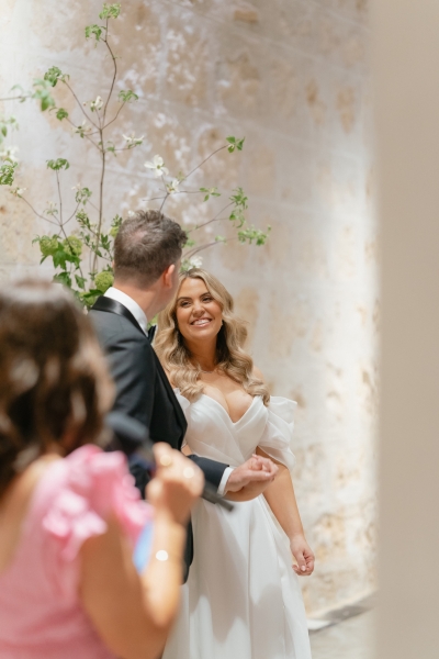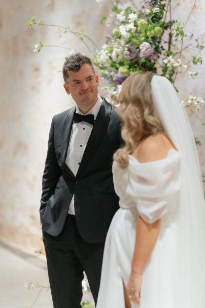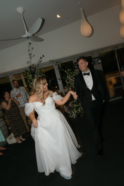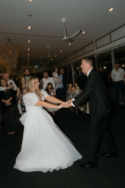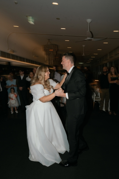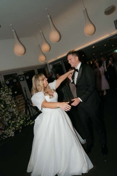 Their first dance was to “Kiss Me” by Sixpence None the Richer, and while neither of them is particularly coordinated, they worked together to choreograph some moves for the day. “We had a lot of fun at home, trying to replicate snippets we saw on TikTok and mashing them together to fit with the timing of our song. I was a little nervous when we realised we were walking into the dance floor from the opposite direction we practised, which goes to show how uncoordinated I am. But it all worked out, and we both agree that our best attempt was the one we did on the day. We just laughed and smiled our way through it together.”