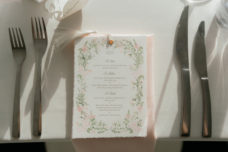 “I love to plan a party or event, so having a whole year to do it was an absolute dream. I loved every minute of the late-night crafting sessions, cutting out swan-shaped place cards, or the dozens of afternoons spent painting different versions of the watercolour flowers for our wedding stationery until I got the colours and technique right. But my favourite part of wedding planning was those moments when Brendan and I would collaborate to bring all these little projects together into something cohesive. From choosing venues, vendors, napkin colours, menus and dance steps, we had a ball doing it together.”