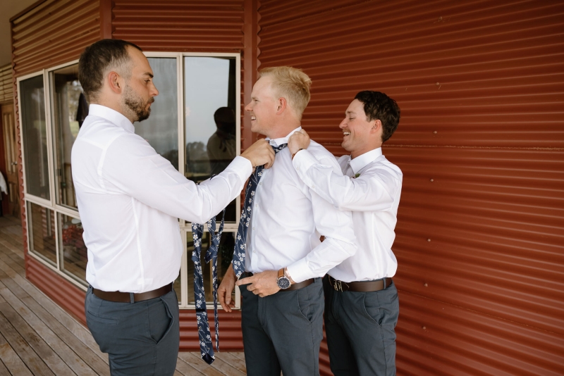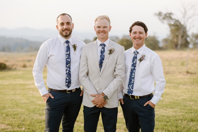 Opting for a classic look with a slight twist, Lindsay chose a sandy jacket and navy blue pants, with a tie that tied into his family history. “He wanted to do something that was sentimental and acknowledged his family history, and build this into his outfit on the day. Lindsay found a patterned floral material online with the Geraldton Wax flower. Lindsay’s family used to be flower farmers (including Geraldton wax) and sold their flowers internationally. His mum (Wendy) made ties for Lindsay, his groomsmen, his father, and his brother-in-law. And even a special bow tie for Lindsay’s dog, Bailey.”