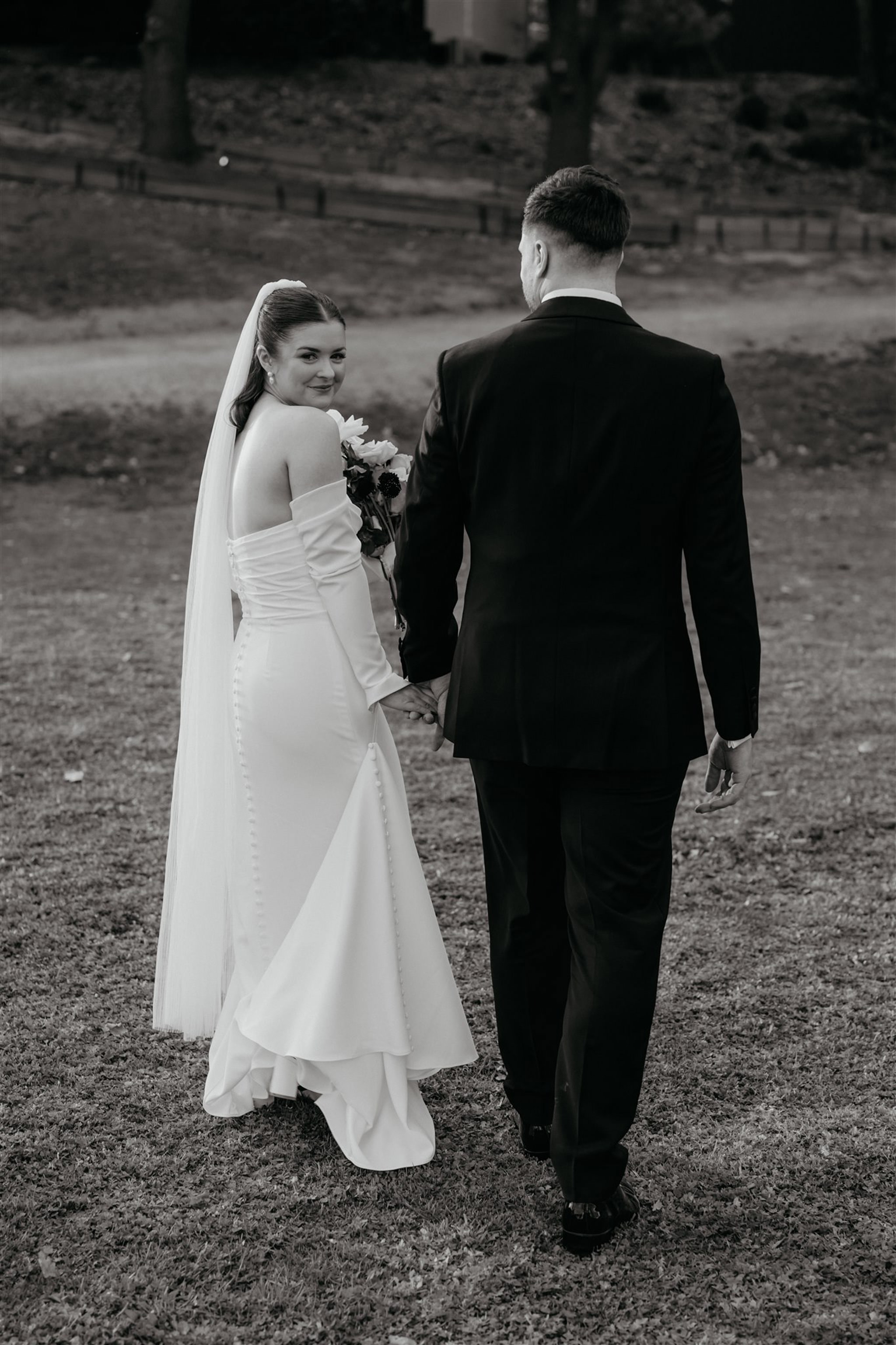 Image three description: Walking in the vineyards, the couple are still hand-in-hand, still with huge smiles on their faces.]⁠