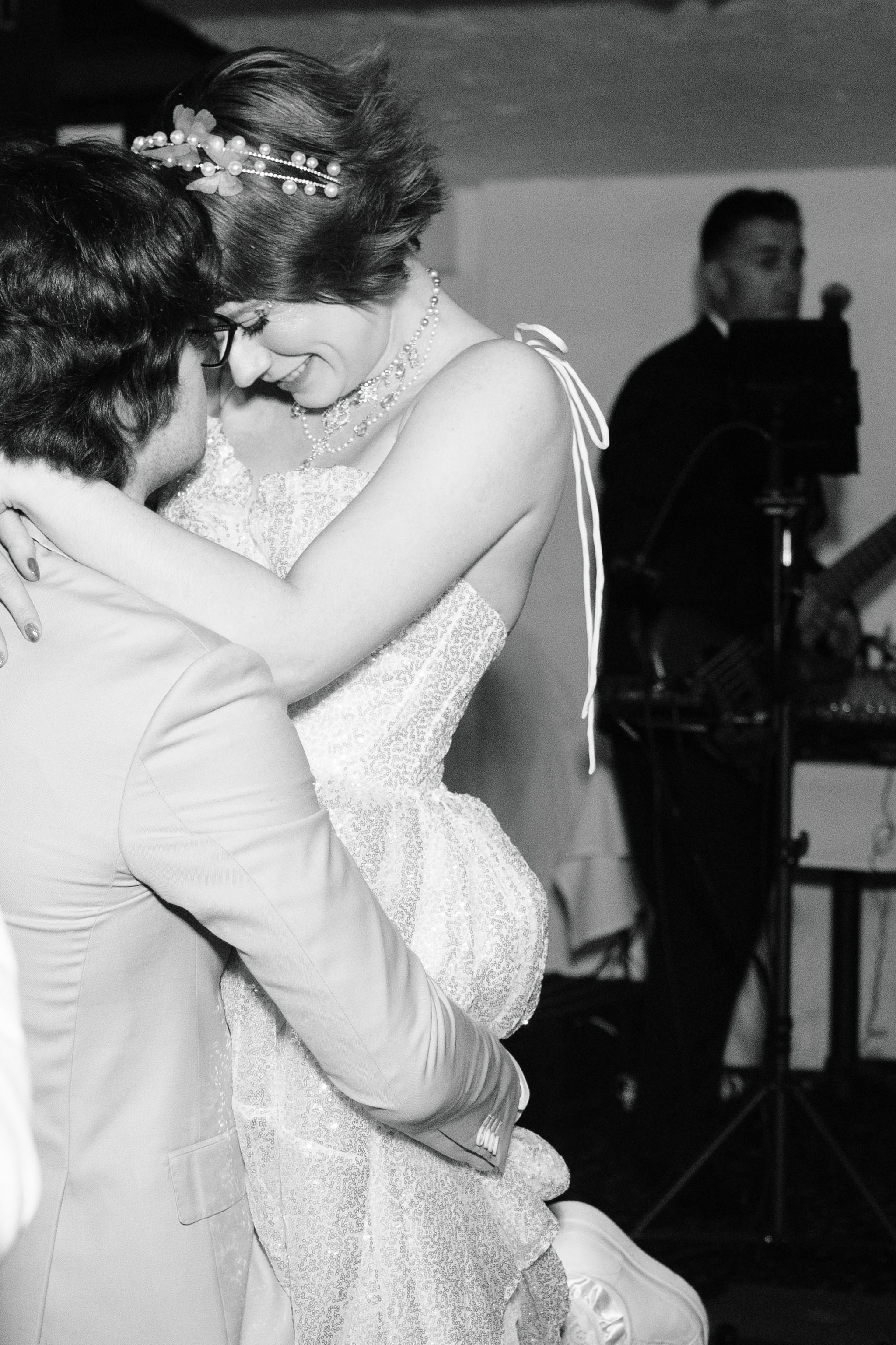 [Image description: A joyful, inclusive wedding dance floor moment with guests of different ages and backgrounds dancing together, clapping and laughing as the celebration comes alive. One guest in a kilt and another in a flowing outfit lead the energy, creating a fun and vibrant atmosphere on the dance floor.]⁠