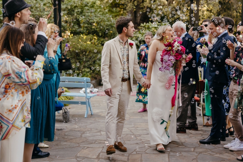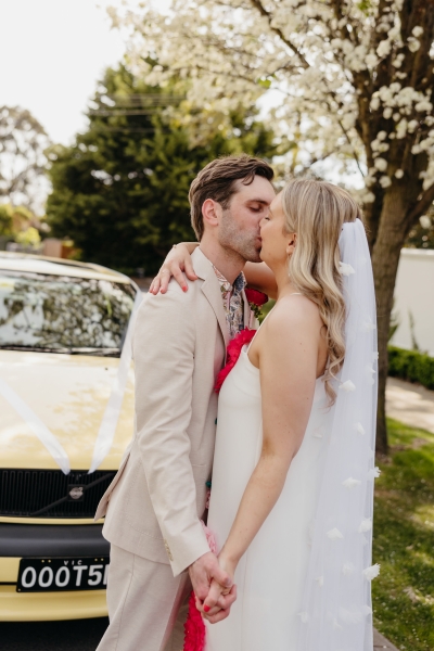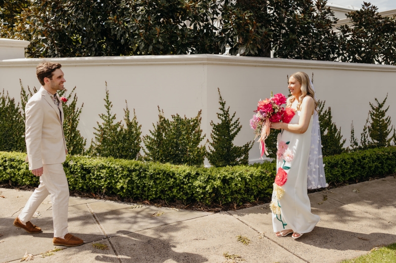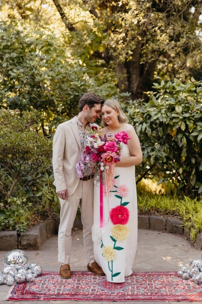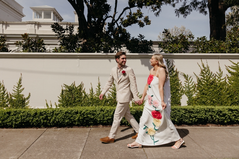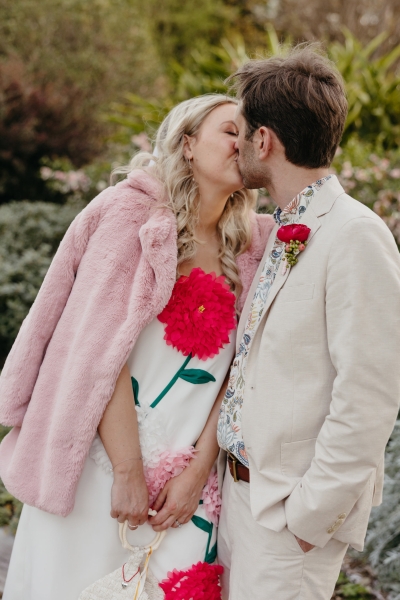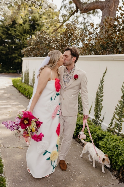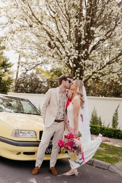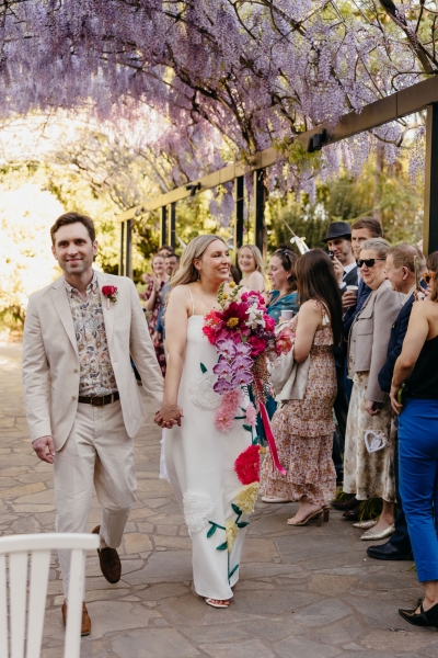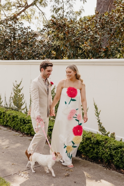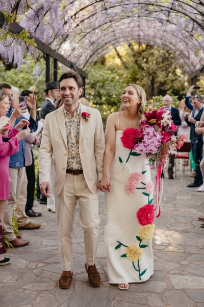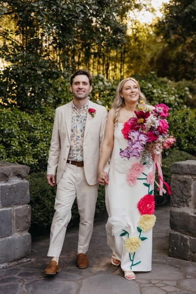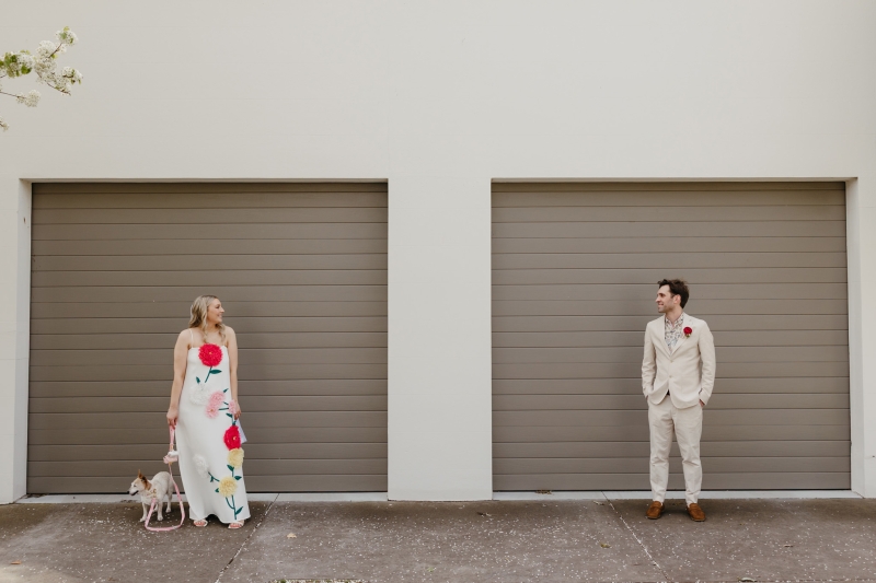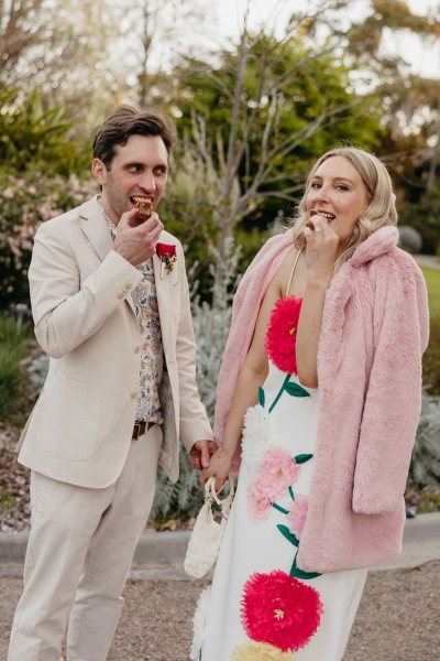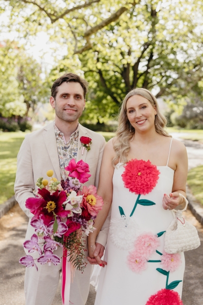 If there was one thing Bec knew about her wedding dress, it was that it definitely wouldn’t be solid white! “She’s known for wearing bright colours and a white dress felt too traditional and boring. Bec was searching the internet for the perfect dress, and as soon as she saw this one from Elliatt, she knew it was the one. It was fun, not overly formal, featured flowers and her favourite colours,” Elliot explained.