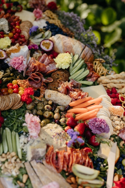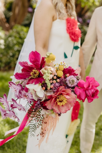 Bec chose the most beautiful and colourful bouquet she could possibly make. Working with Ashleigh from Floral Alchemy, she created love in flowers. “I discussed using similar colours that were in the dress – pinks, reds, and yellows. It featured draping ribbons and peppercorn berries (We have one of these trees near our house, and it reminds us of home). It was the most beautiful bouquet of flowers I have ever seen. The florist made up a few other arrangements for us in test tube vases. My friends and family also assisted by purchasing flowers and setting them up in little brown glass bottles and placing them on the food tables,” Bec explained.