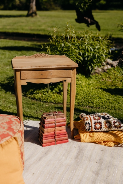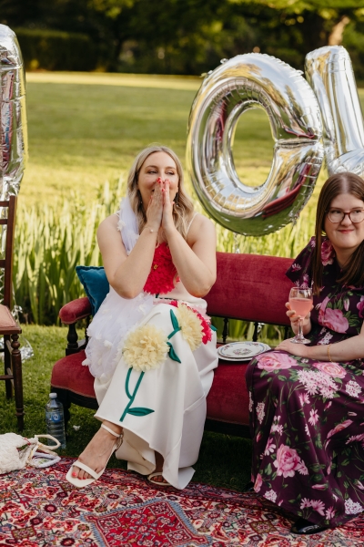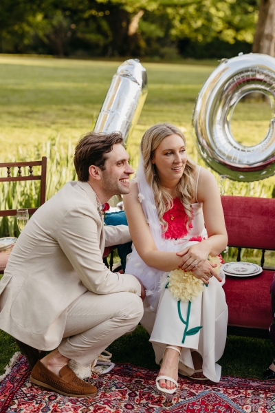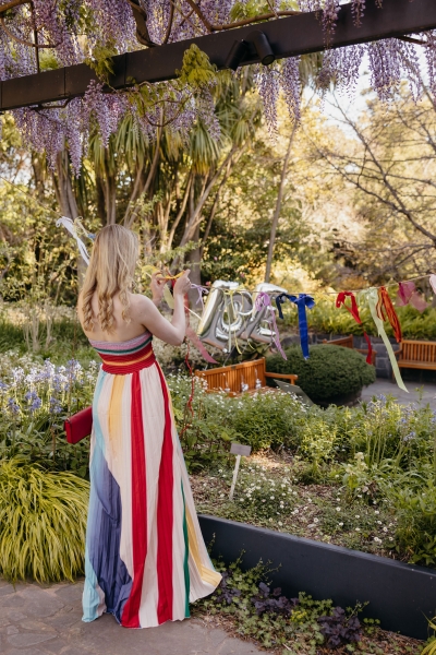 The whole day was thrifted and re-loved, built with pieces entirely sourced by Bec. Scoured from hard rubbish and op-shops, and donated by loved ones, everything from the rugs to the cutlery was hand-picked to celebrate this joyous day. “The day was all about JOY, celebration, COLOUR, FUN. The day was also very emotionally charged, due to Bec receiving a Stage IV (incurable) breast cancer diagnosis at the start of the year.”