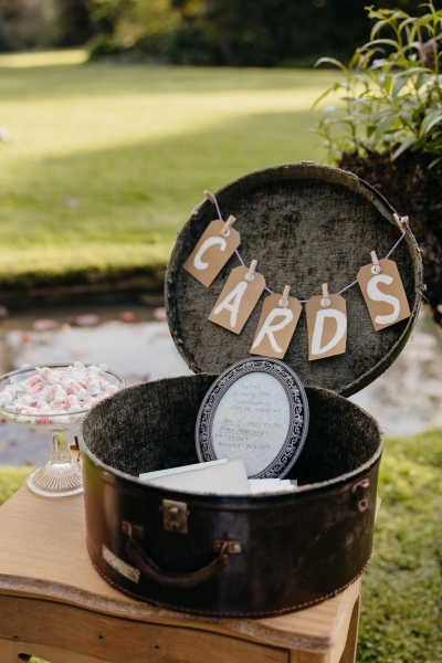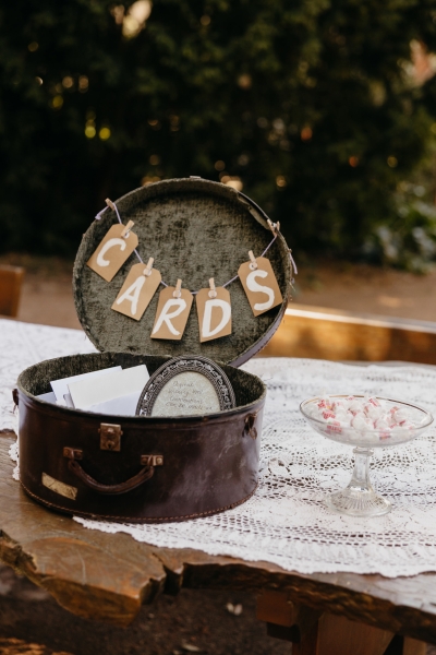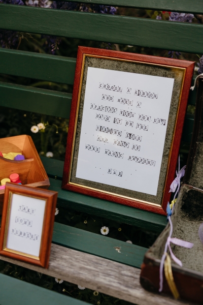 Due to Bec’s health, the six months leading up to the wedding were spent pulling together every piece of the day. Including this incredible wishing line, they created. “Elliot lined an old vintage suitcase, and I collected an array of pre-loved ribbons (all different colours and styles). Ribbons were placed in the suitcase, with a handmade sign with stamped letters.”