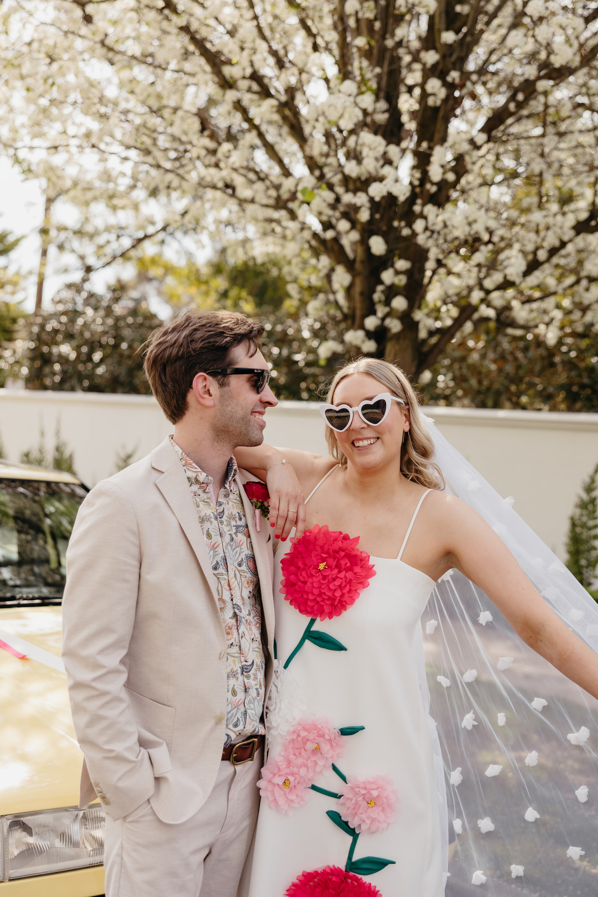 [Image one description: A couple beaming with joy as they pop confetti guns in a beautifully manicured garden. The bride wears a white halterneck dress with daisy details all over. The groom wears a classic suit and tie. ⁠