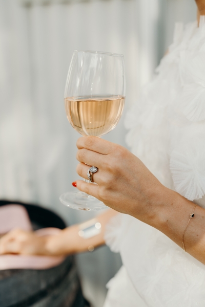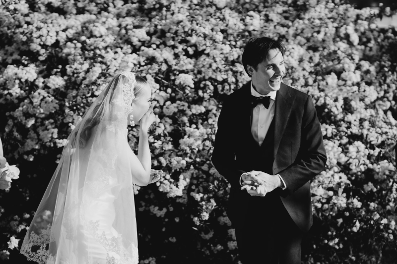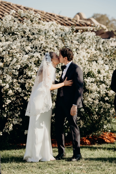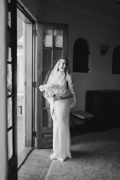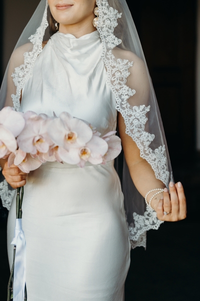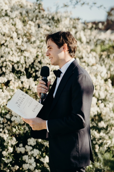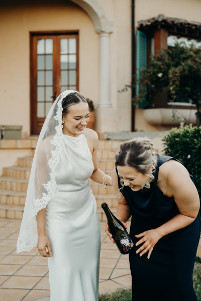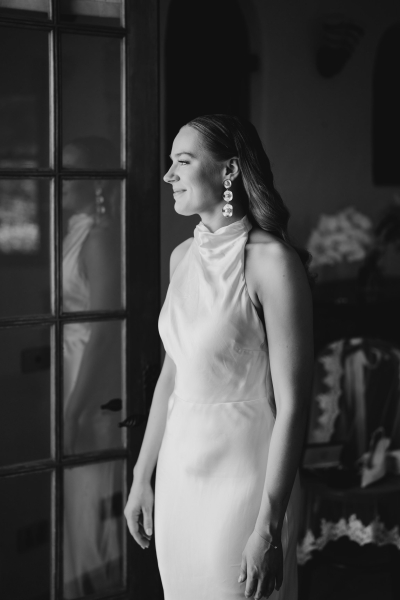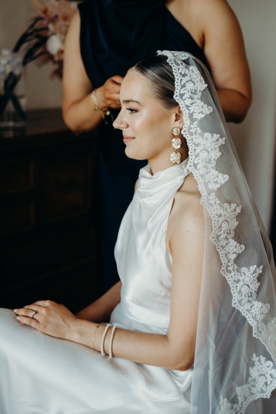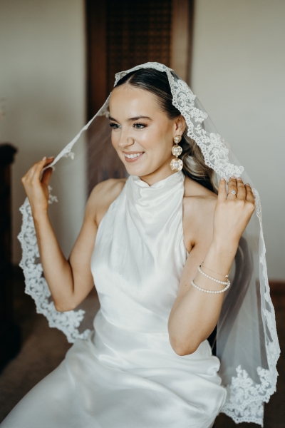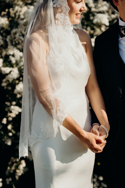 Jess wore a beautiful slinky white gown, complete with a halter neck, pink heels and a vintage mantilla veil. “It added such a timeless, romantic touch to the day. I loved the delicate lace detail and the way it tied in perfectly with the classic European feel we were going for – elegant, meaningful, and a little bit old-world,” she explained.