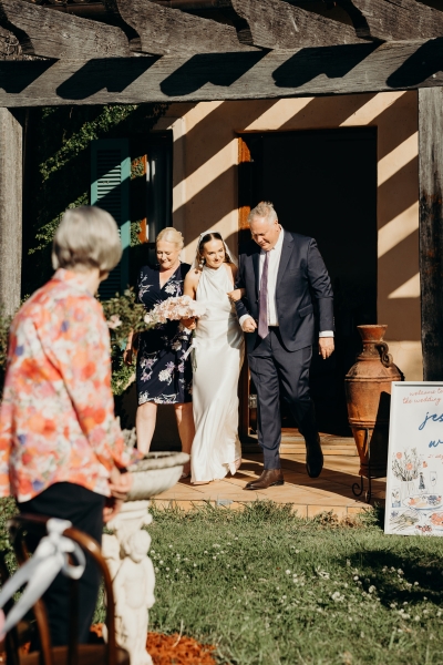 Jess walked down the aisle with her mum and dad at her side as a slow version of “Two Strong Hearts” floated through the garden. “We also saved the iconic John Farnham version for the end of the ceremony – the perfect way to bookend such a special moment. This song is so us; there’s no need to overthink the emotion, it just feels completely natural and effortless.”