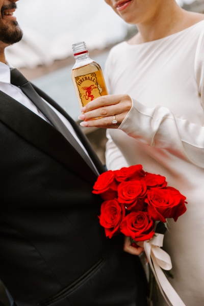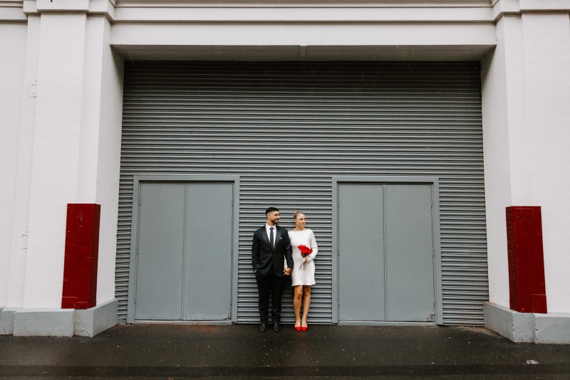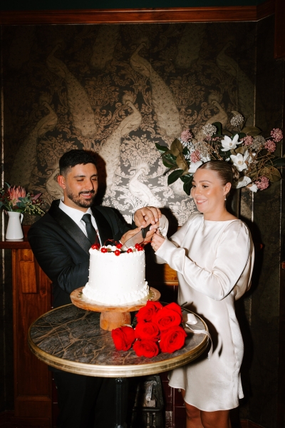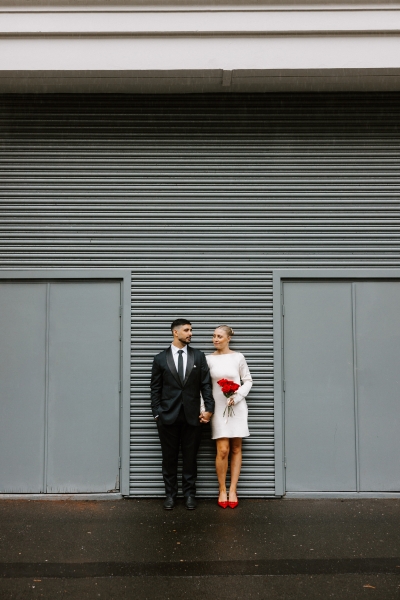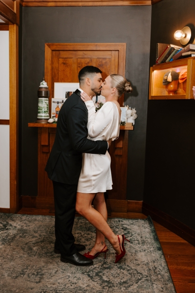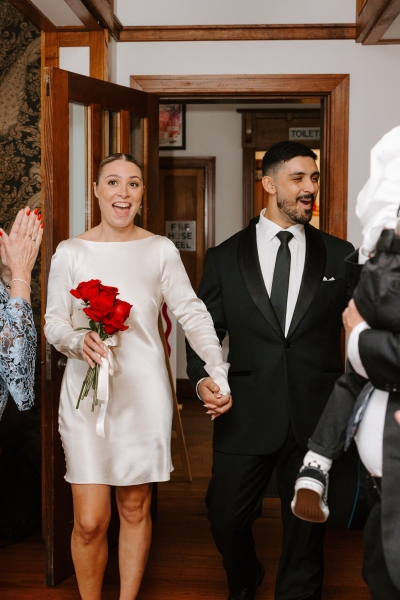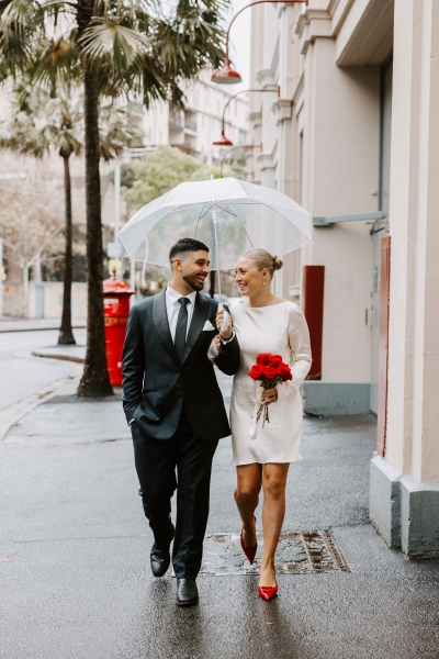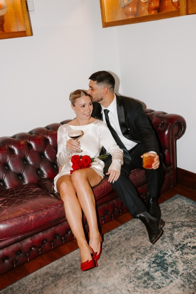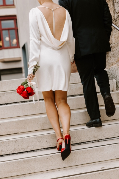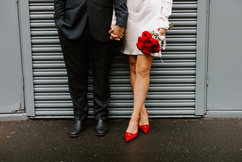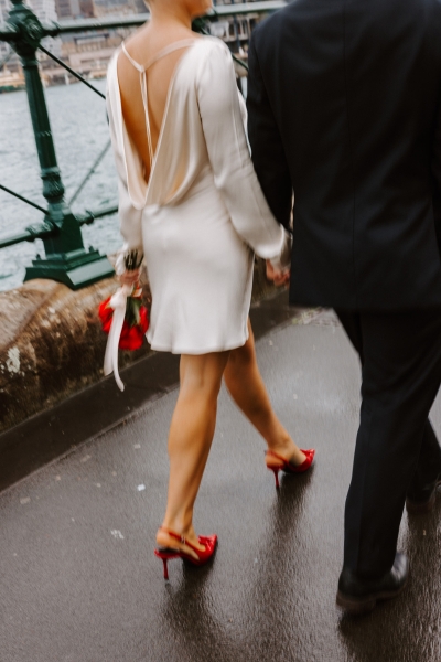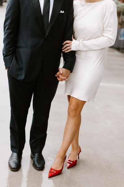 Since their micro wedding was in winter, Alex wanted to contrast the grey weather with a vibrant pop of red. Paired with her beautiful champagne dress from Shona Joy, she picked out red heels from Zara and held a bouquet of red roses. “I wore my mum’s earrings from her wedding, which made it all! I love the pop of colour in photos, but I am not a bright colour person, so this was perfect. It felt timeless to me,” she shared.