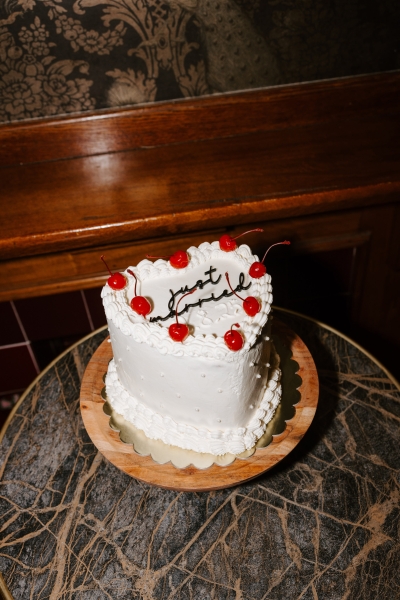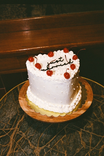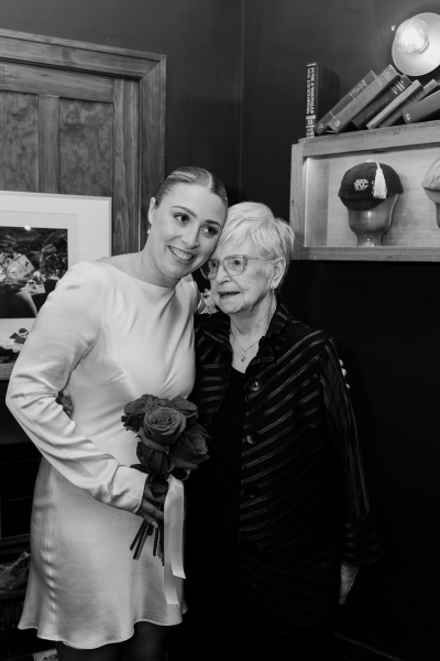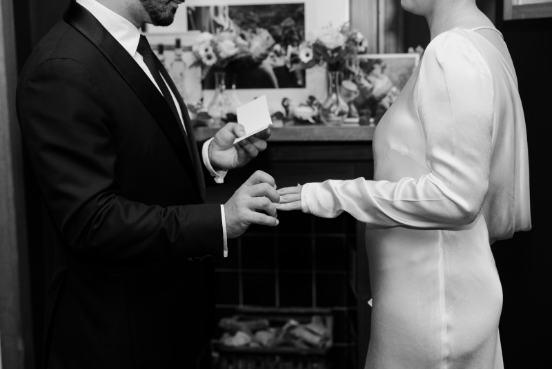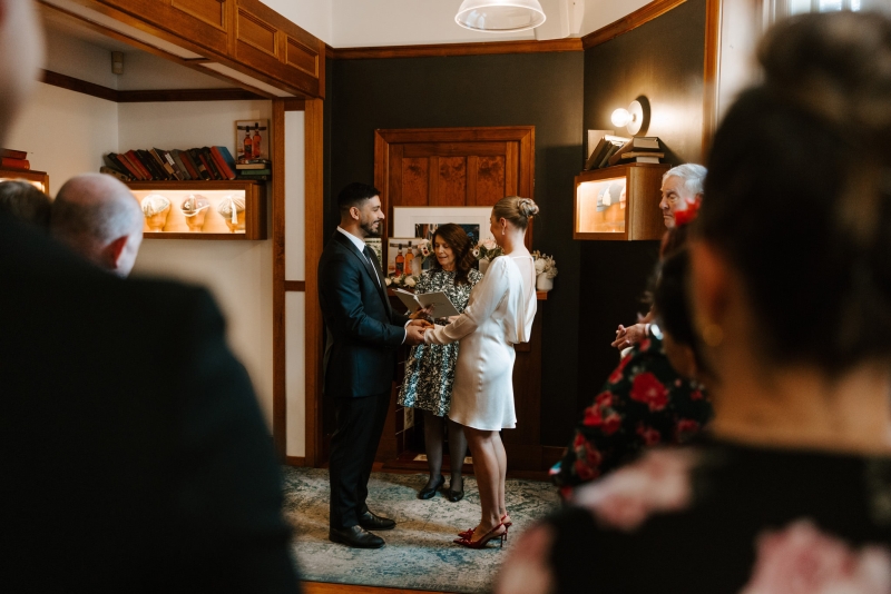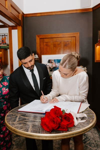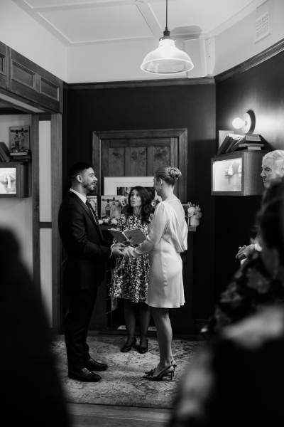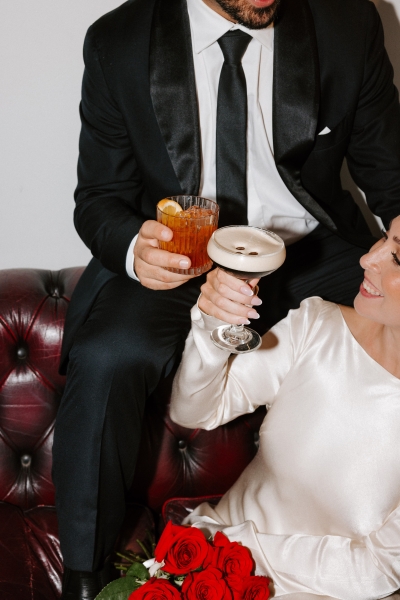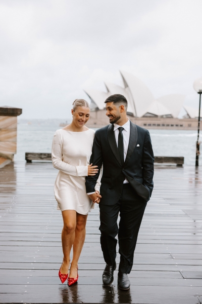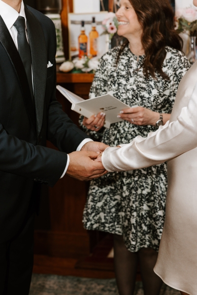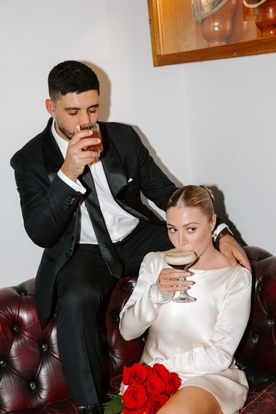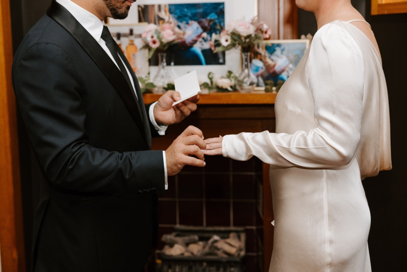 Since their micro wedding was in winter, Alex wanted to contrast the grey weather with a vibrant pop of red. Paired with her beautiful champagne dress from Shona Joy, she picked out red heels from Zara and held a bouquet of red roses. “I wore my mum’s earrings from her wedding, which made it all! I love the pop of colour in photos, but I am not a bright colour person, so this was perfect. It felt timeless to me,” she shared.