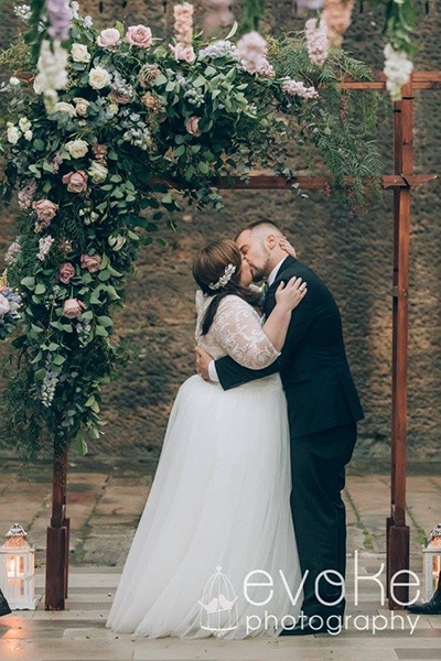 Under a wisteria-covered arbour, white furniture and accessories, silverware, silver candelabra filled with lots of ivory or lavender candles, silver-edged glassware, containers overflowing with soft yellow and purple blooms of all hues, enlivened with touches of green foliage, a white cake decorated with the same flowers either fresh or sugar versions.