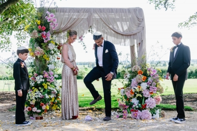 Tess & Josh Saying their vows in front of a circle covered with pink and white flowers, Tess and Josh […]